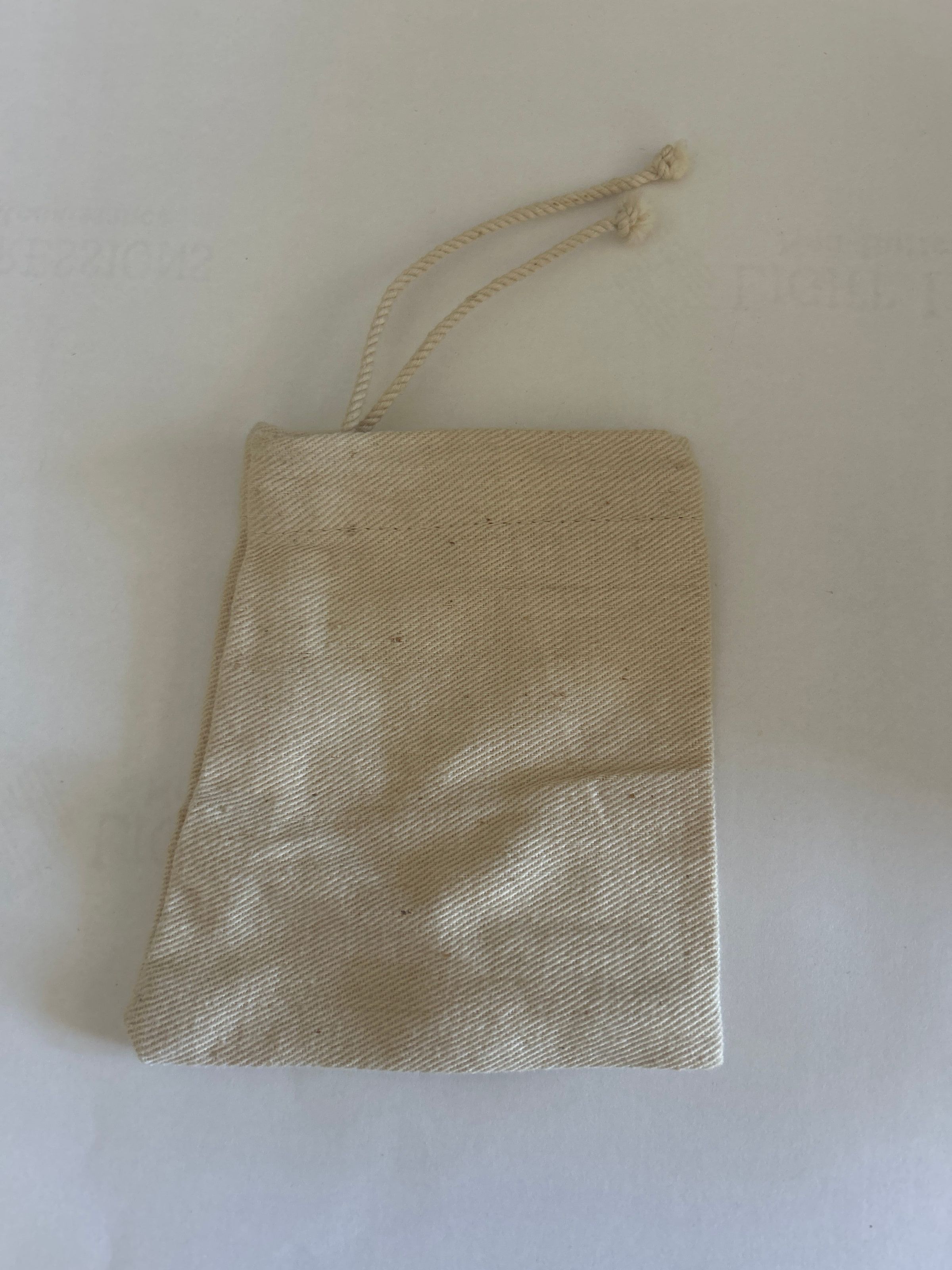 Cream bag made of heavy cotton cloth (canvas?) 5 1/4 inches x 4 1/4 inches with a cotton cord 16 1/2 inches long to close the bag.