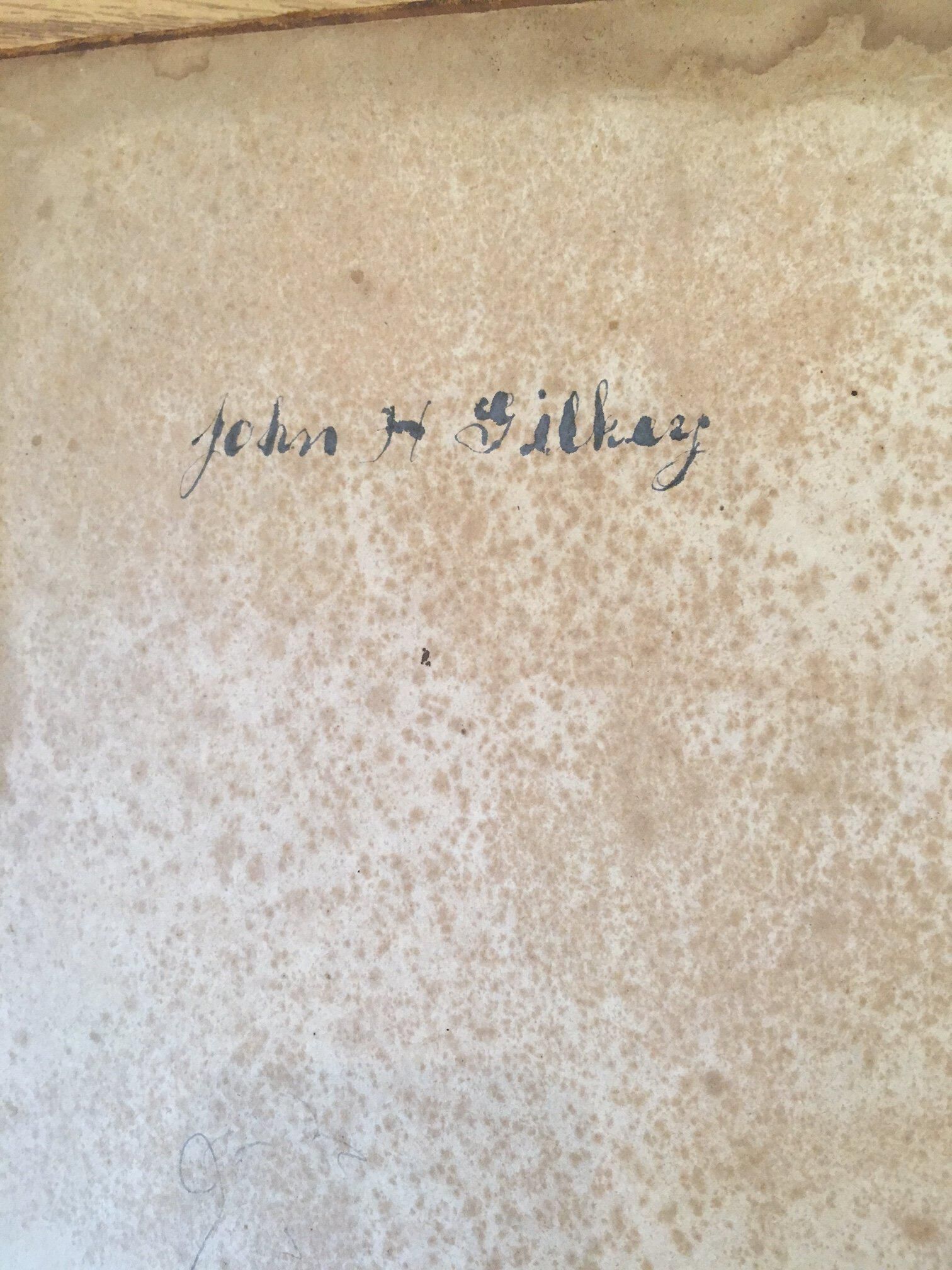 Bible, English, Old and New Testaments, King James Version (Genesis - Revelation), including Plates, Apocrypha, and Index, 9" x 11.25" x 3", leather cover. Inscribed with the name John H. Gilkey. Family Record intact, dates beginning 1764 (copied and included in Genalogies as 2017.006.005).