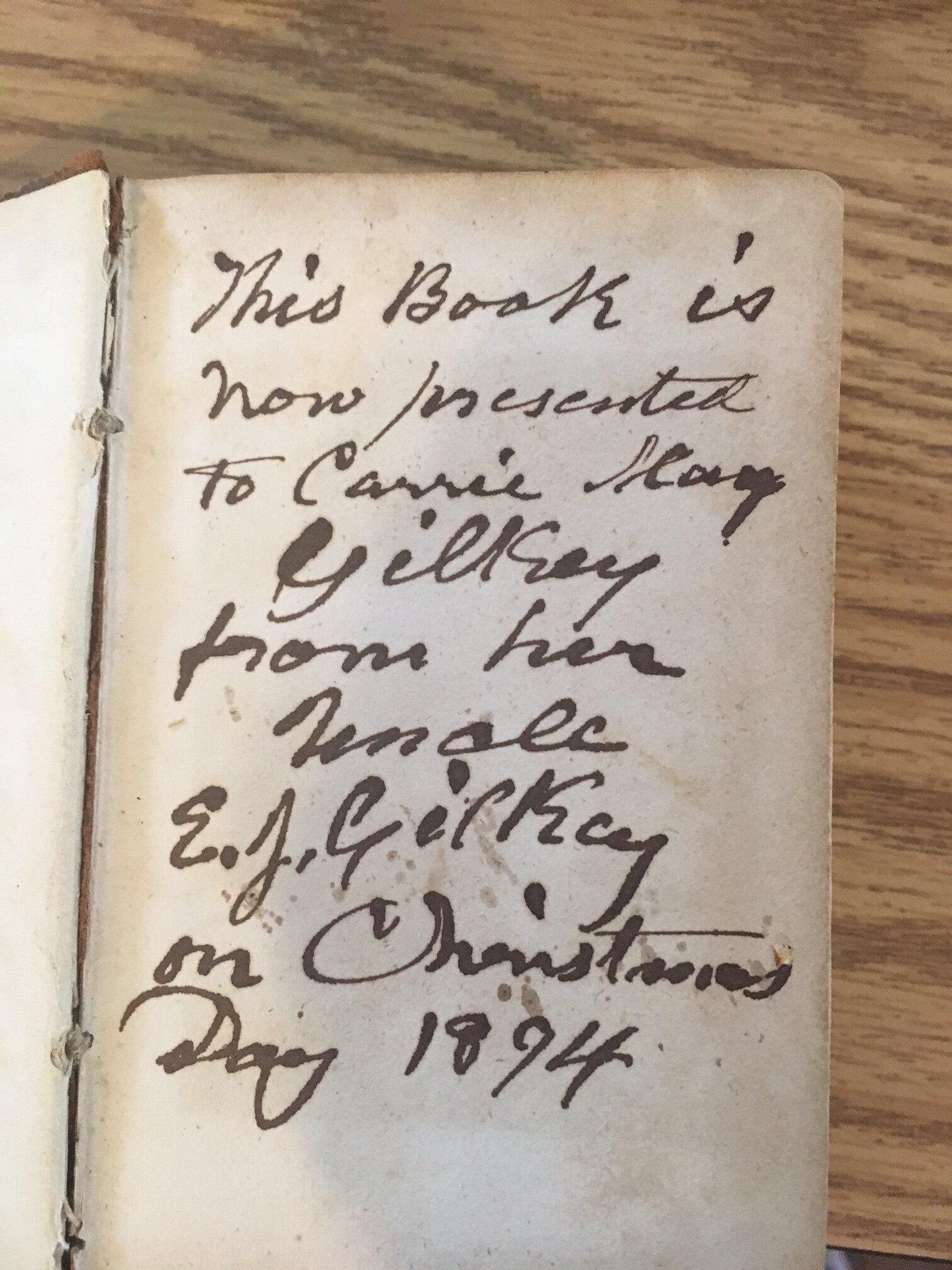 "This book is now presented to Carrie May Gilkey from her uncle E. J. Gilkey on Christmas Day 1894"