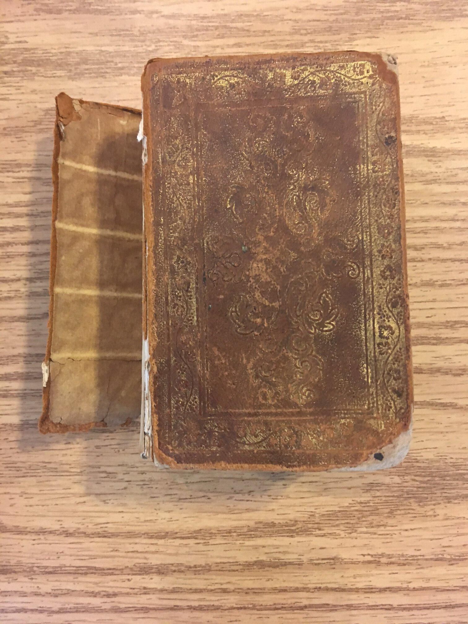 Small bible, Old and New Testaments (Genesis - Revelation), published 1844 by S. Andrus and Son, Hartford; 3" x 4.5" x 2", leather cover, torn spine, but otherwise solid.