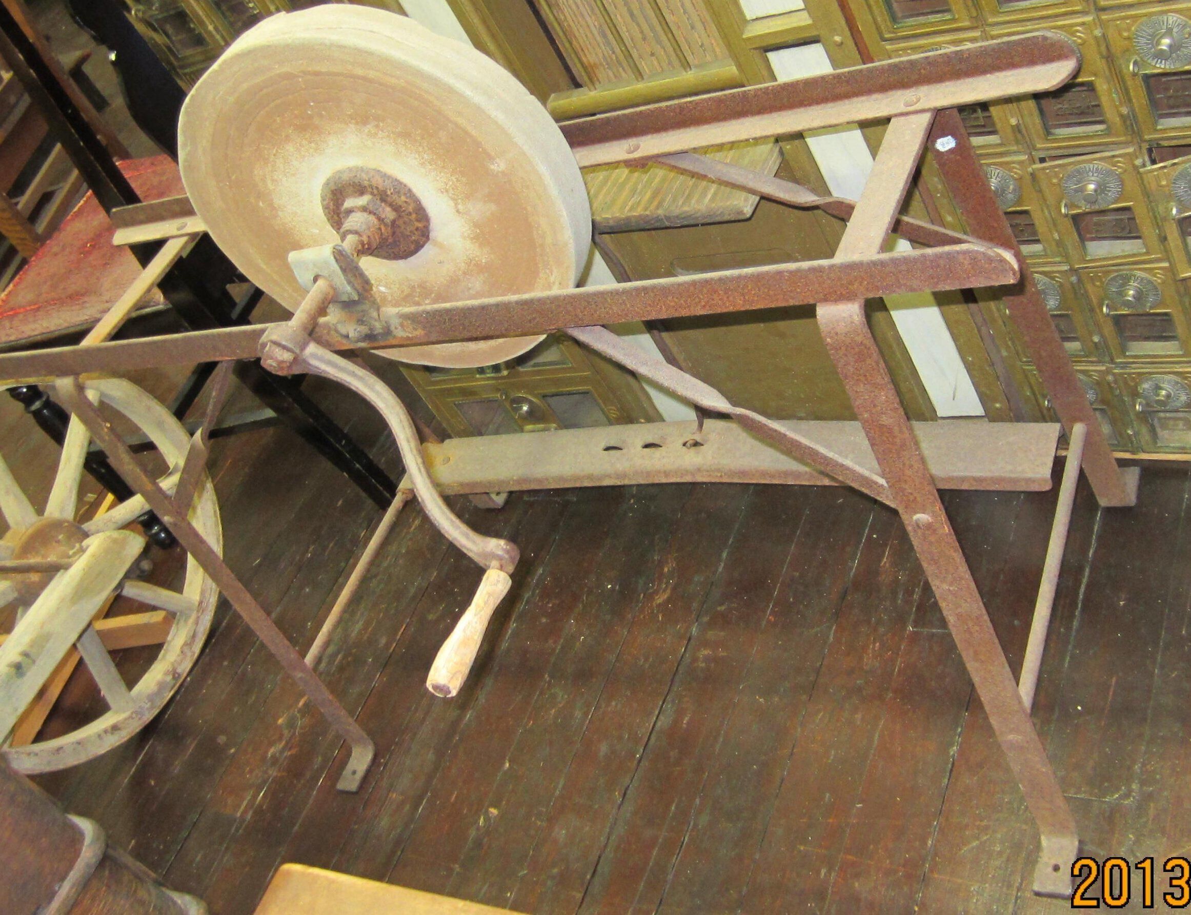 Grindstone 24 inches in circumference attached to a shaft with a handle and mounted on a metal stand. Stand is approximately 41 1/2 inches x