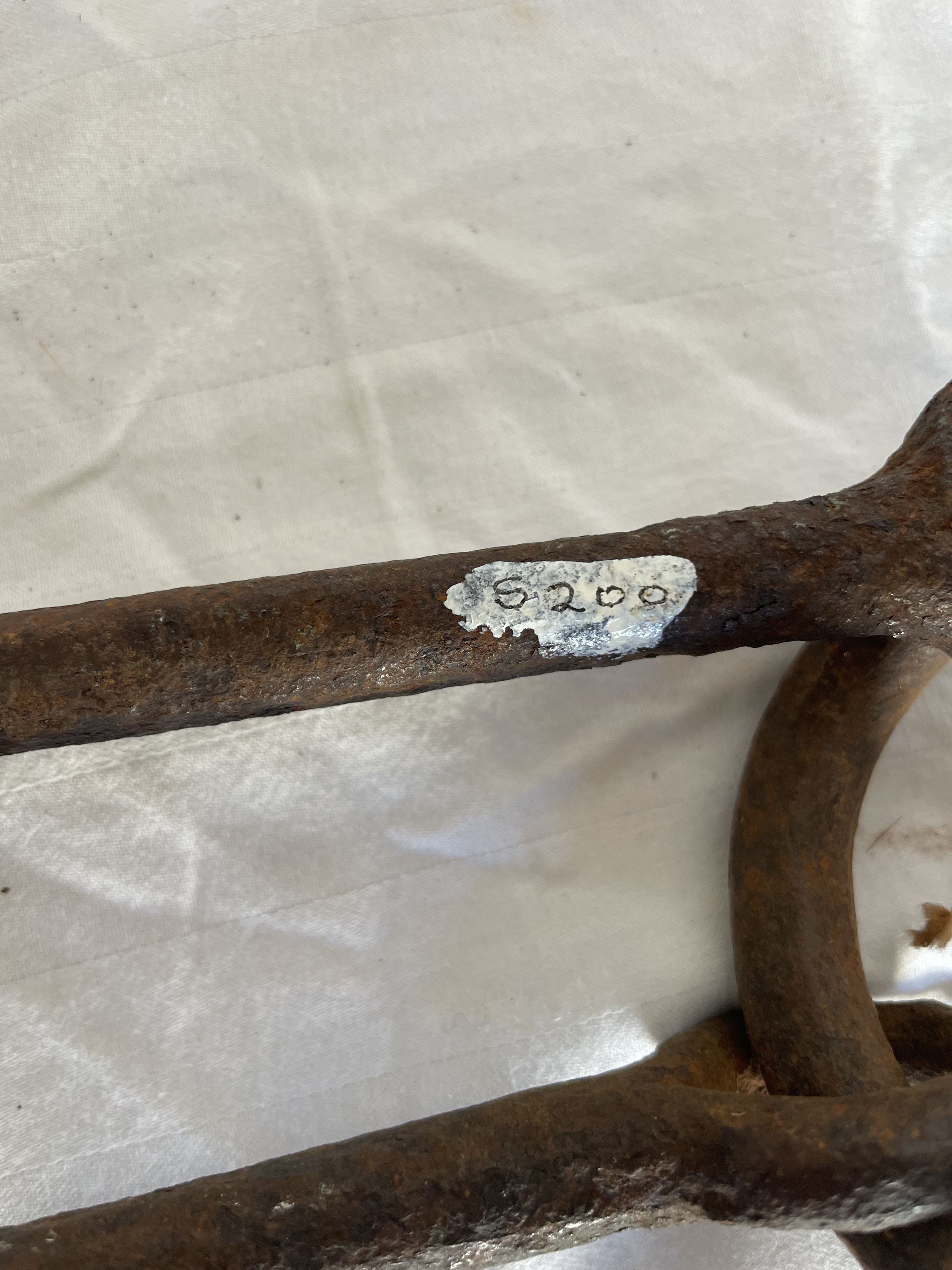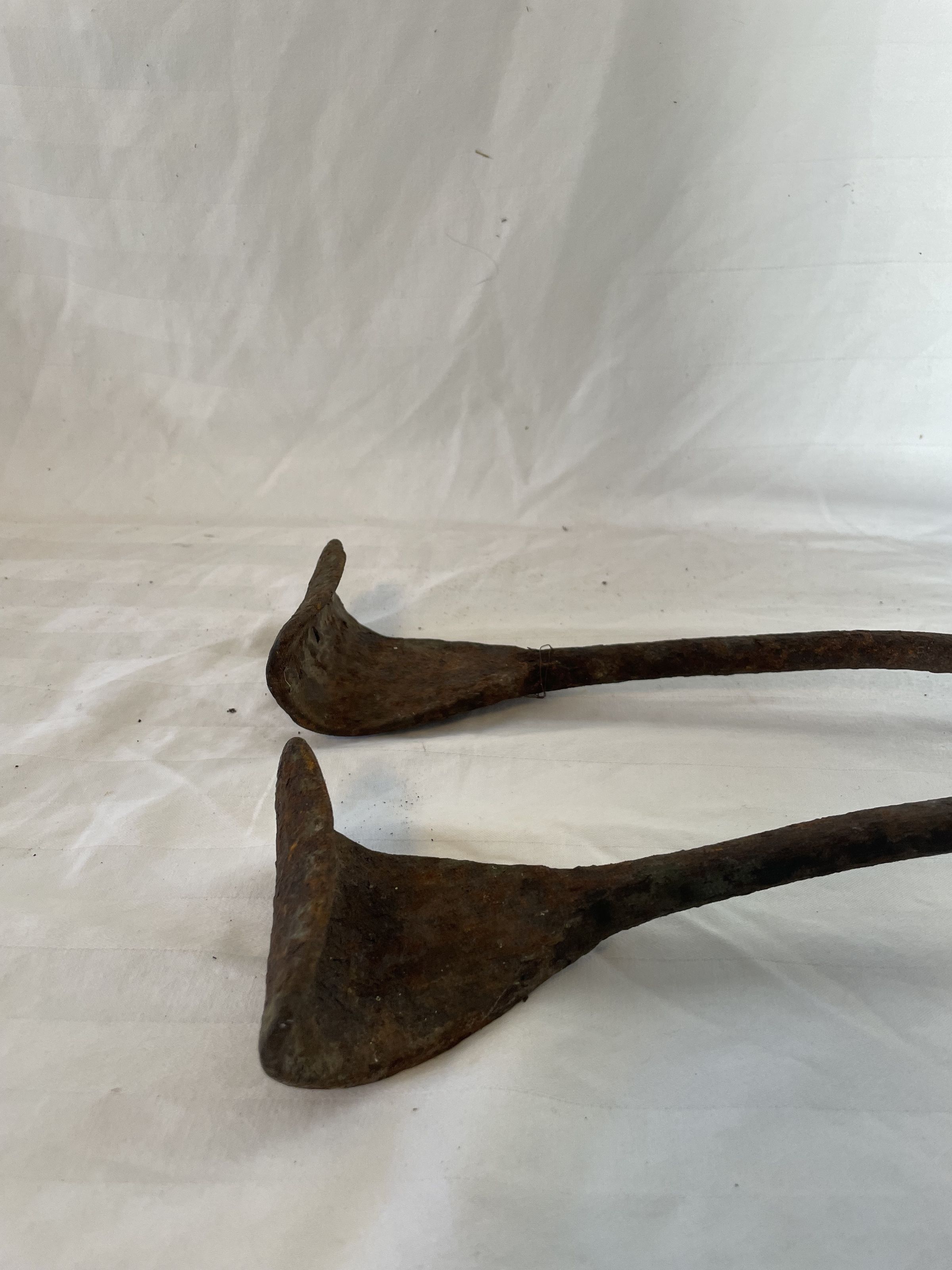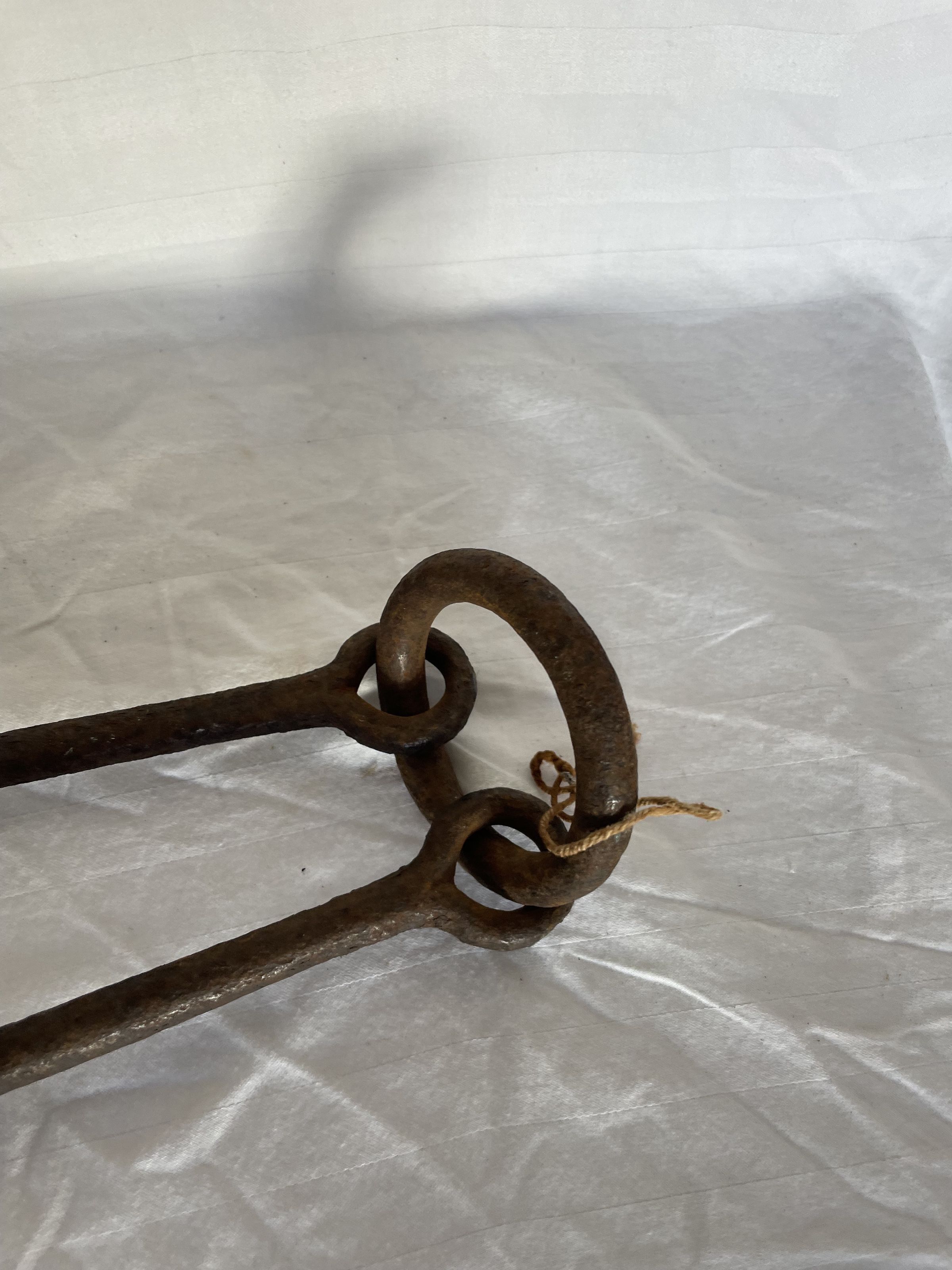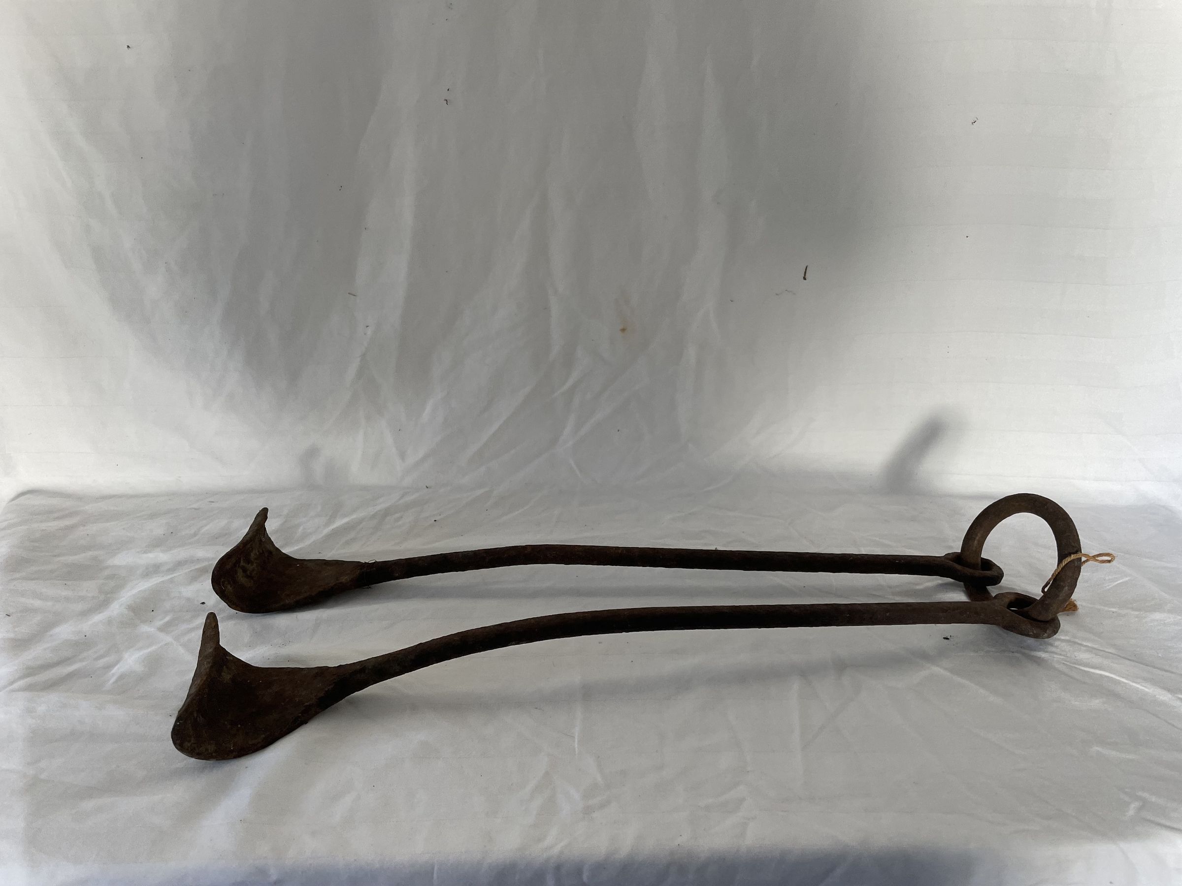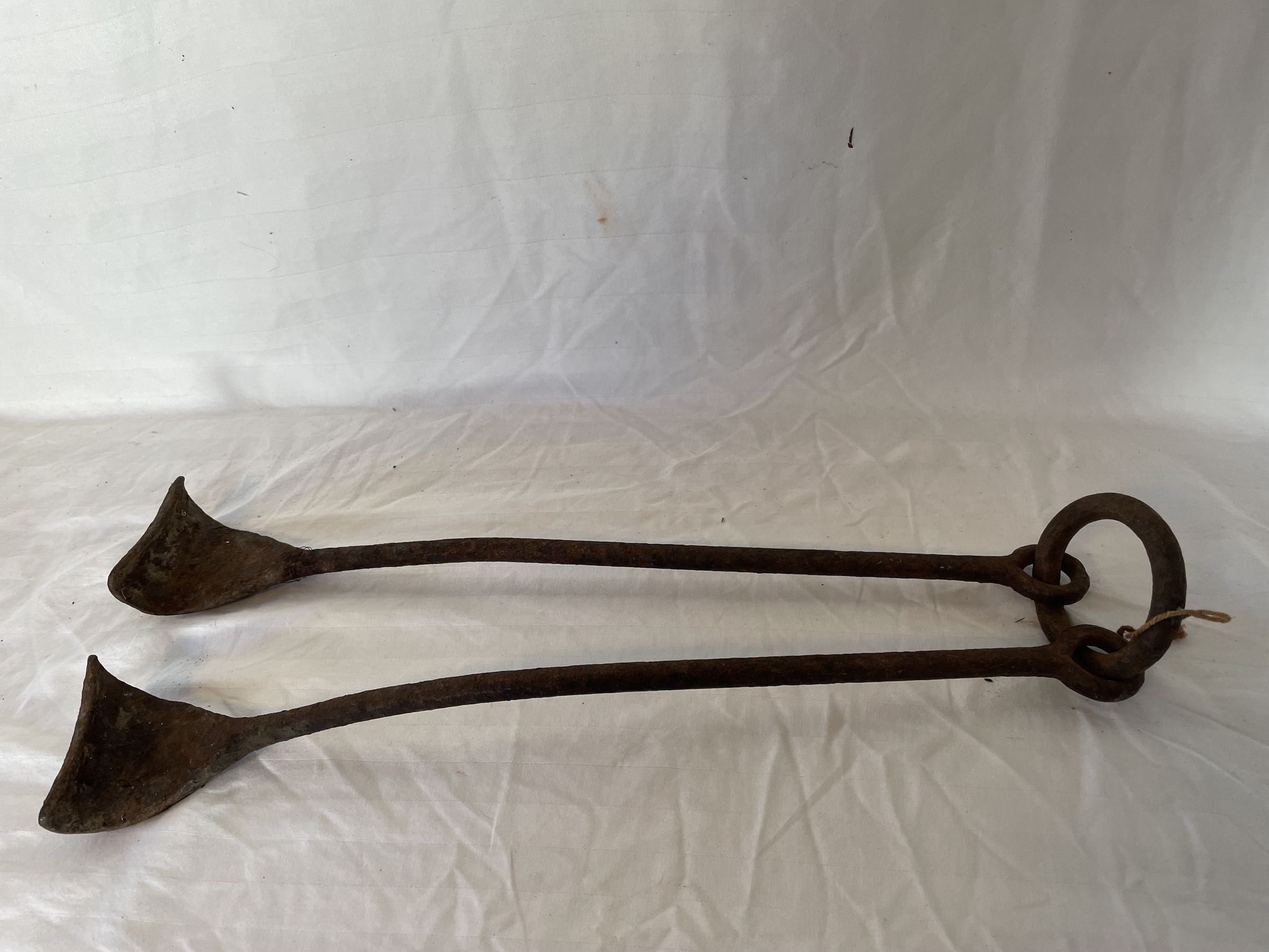 Cast iron tongs. Two long shafts, flattened and curled at the end. This object appears to be tongs but they do not hinge/connect like normal tongs. They are fastened to a cast iron ring.