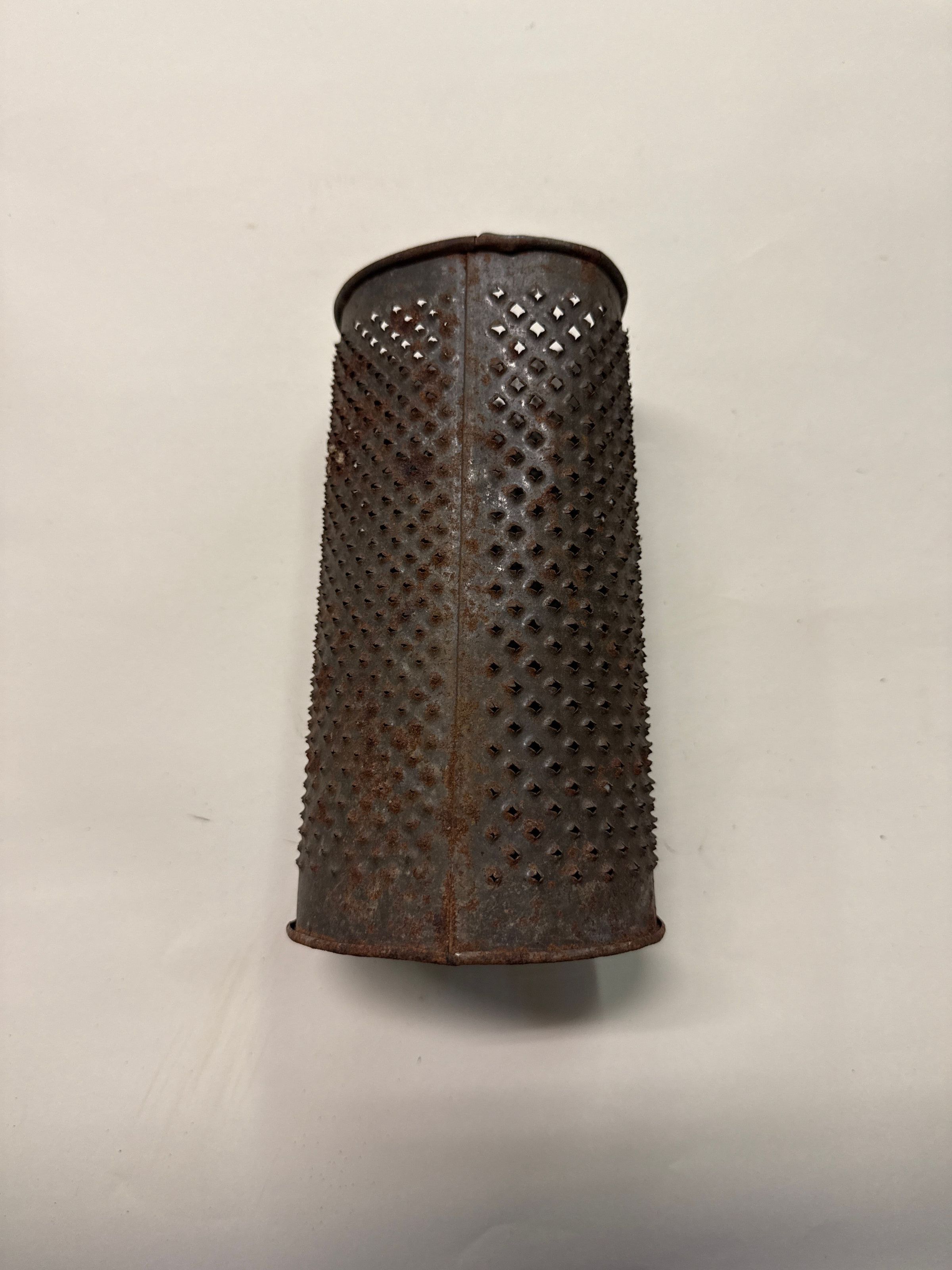 Tapered, 7 3/8 inches high x 4 inches diameter at base, 3 5/8 inches diameter at top. Has coarse, medium and fine grating holes. Rough on outside; smooth on inside.