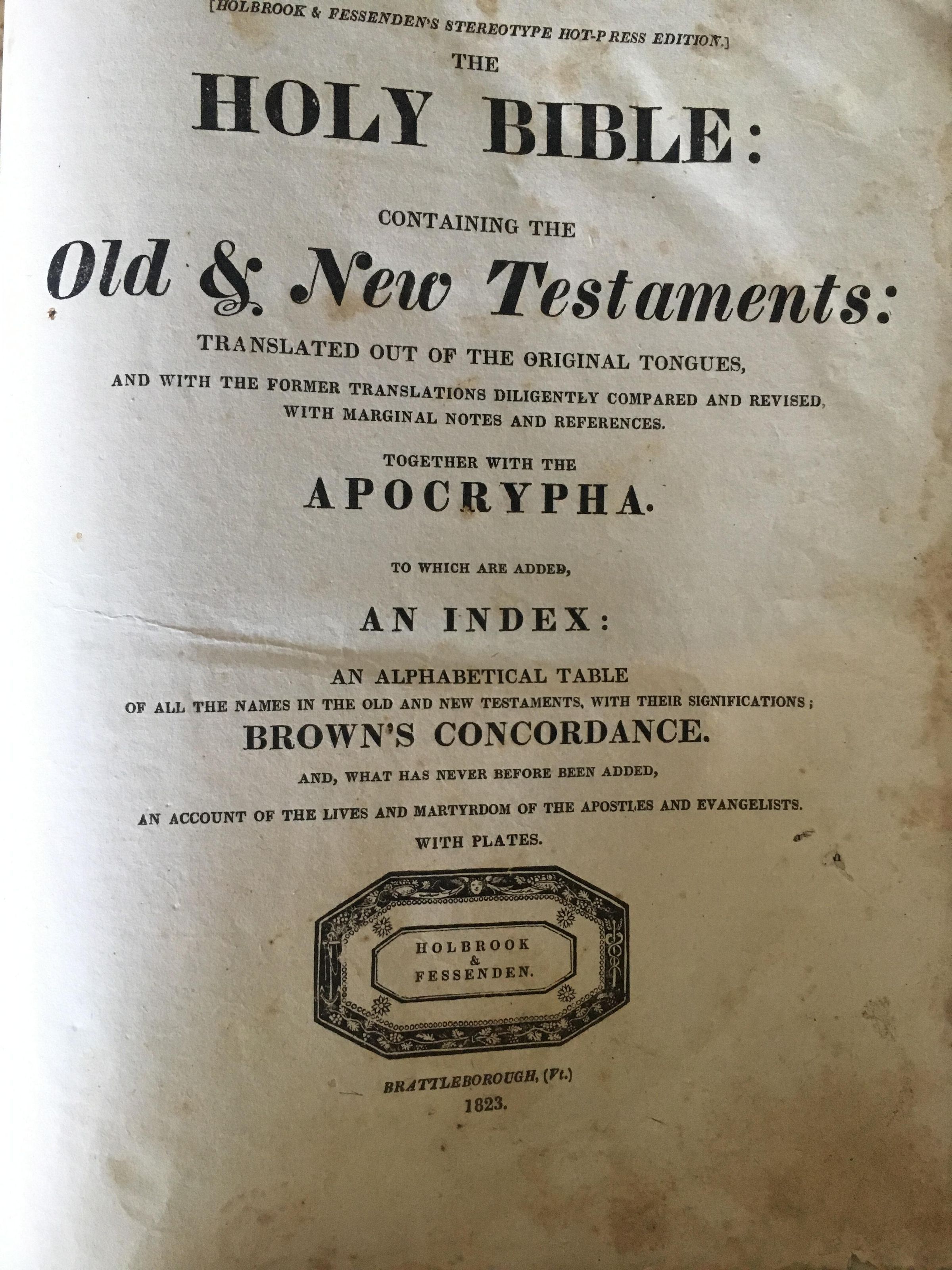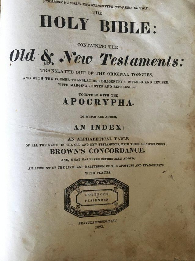 "The Holy Bible: Containing the Old & New Testaments: Translated out of the original tongues, and with the former translations diligently compared and revised with marginal notes and references, together with the Apocrypha. To which are added, an Index: An Alphabetical Table of all the names in the Old and New Testaments, with their significations; Brown's Concordance. And, what has never before been added, an account of the lives and martyrdom of the Apostles and Evangelists. With Plates. " Holbrook & Essenden. Brattleboro, Vt, 1823.