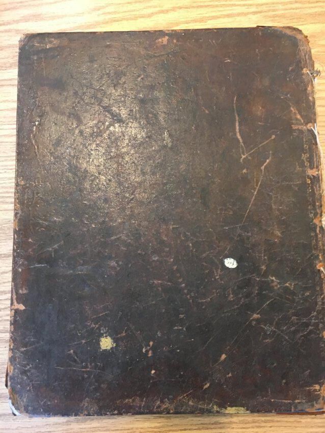 Large Pendelton family bible, 9.5" 11.5" x 4.25", covered in brown leather, front and back covers both loose, binding still secure. Inside front cover has penciled calcualtions. Family pages copied and added to Genealogy files (2018.041.002).