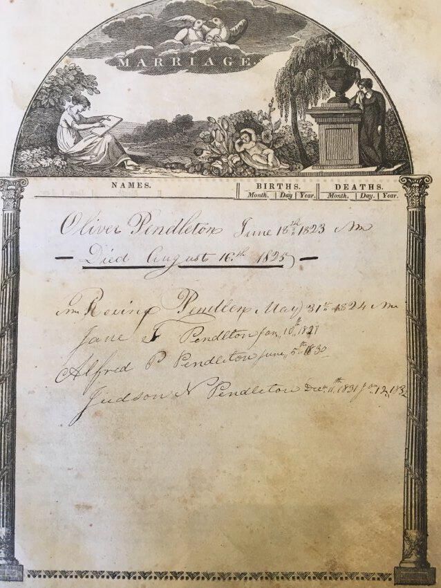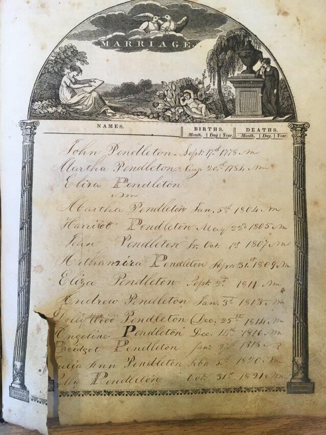 Earliest family entry is for John Pendleton, born September 17, 1778. List of names matches closely with entry for the children of Captain John Pendleton in Groves, Vital Records of Islesboro, Maine (Rockport, Maine: Picton Press), p. 14.