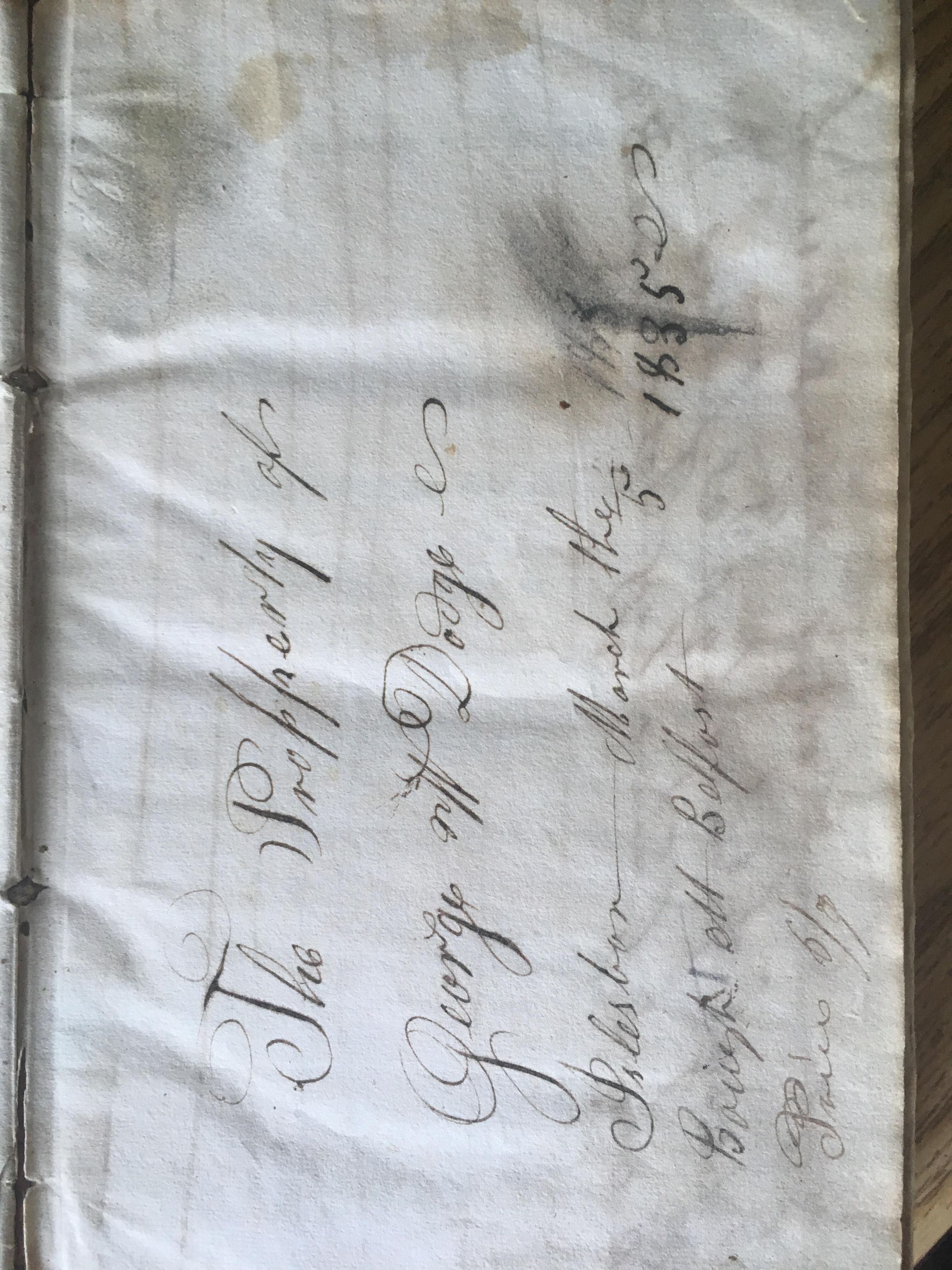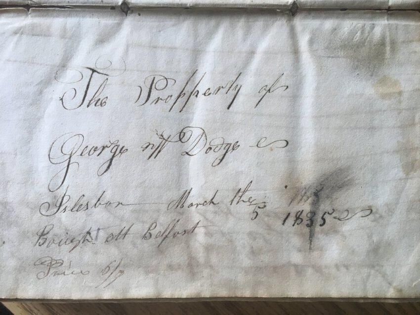 "The Propperty of George W Dodge, Islesboro, March the 5, 1835, Bought att Belfast, Price[?] 6/9"