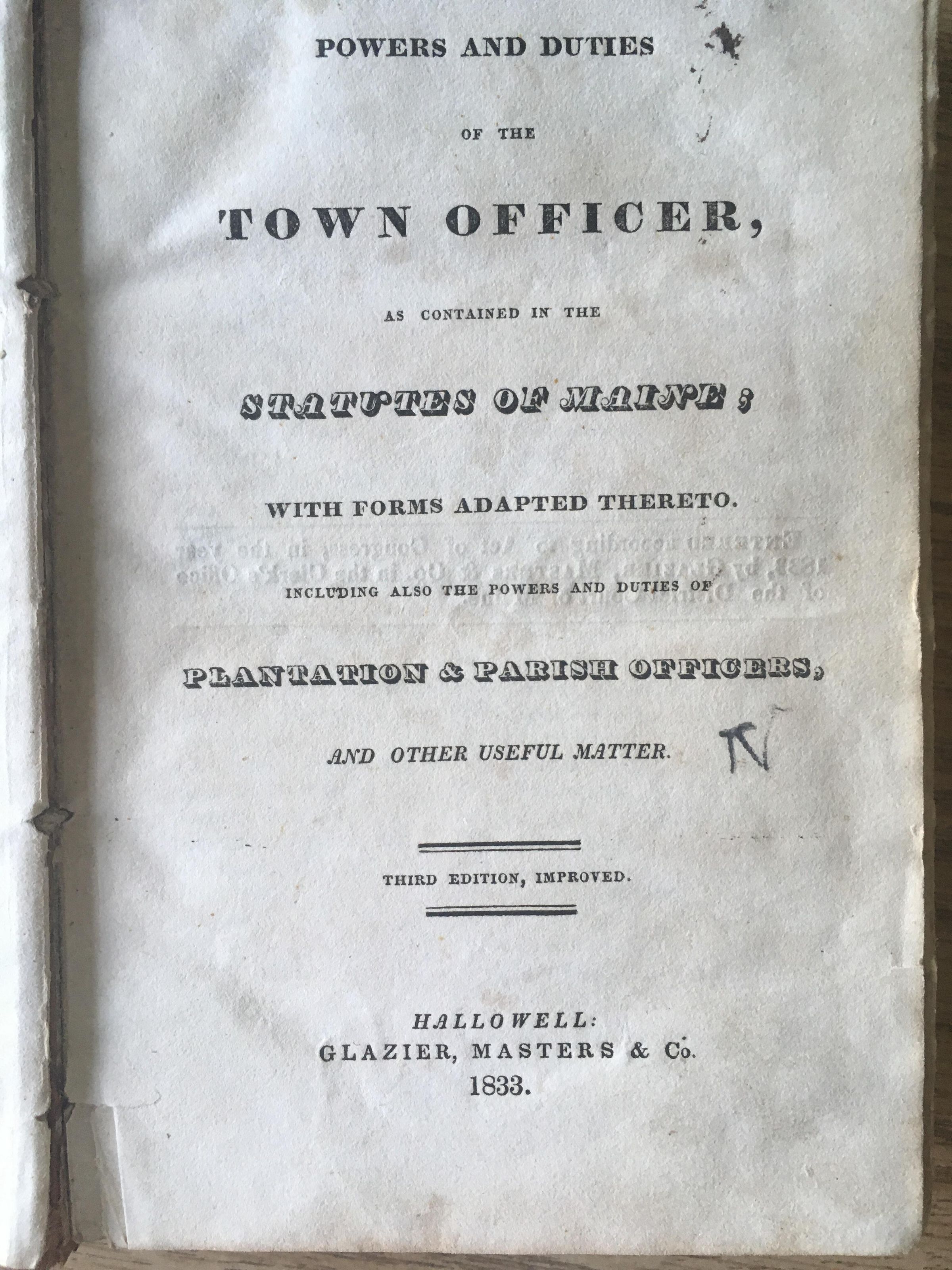 "The Powers and Duties of the Town Officer, as Contained in the Statutes of Maine," 3rd ed., improved (Hallowell: Glazier, Masters, and Co., 1833).