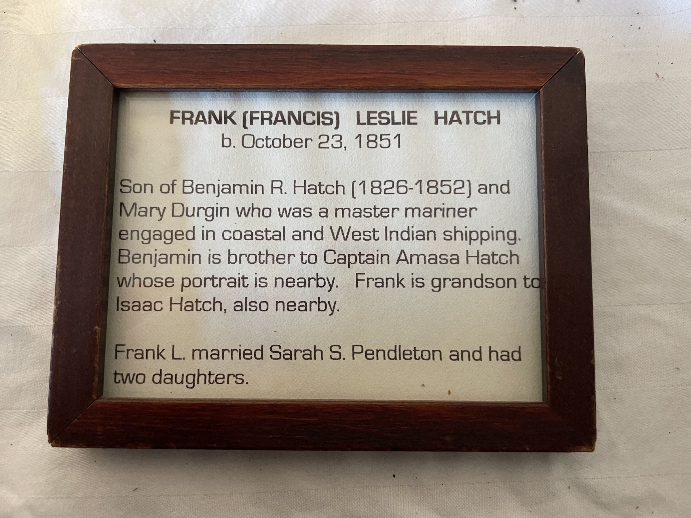 FLH was born on October 23rd, 1851. Son of Benjamin R Hatch and married Durgin. He was a master mariner, engaged in coastal and west indian shipping. Brother to captain Amasa Hatch, married to Sarah Pendleton and had two daughters (Lulu and Edith)