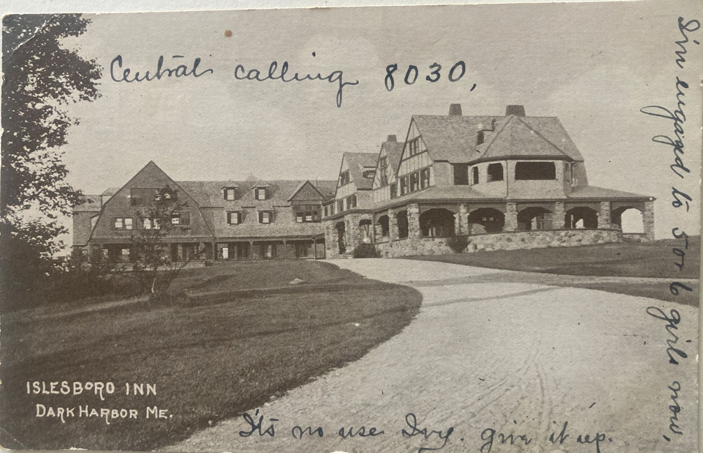 Unstamped, undated postcard of the Islesboro Inn, possibly hand delivered, addressed to Miss Ivy Babbidge, Dark Harbor, Maine. Amusing message ad the edges of the image on the front of the card: