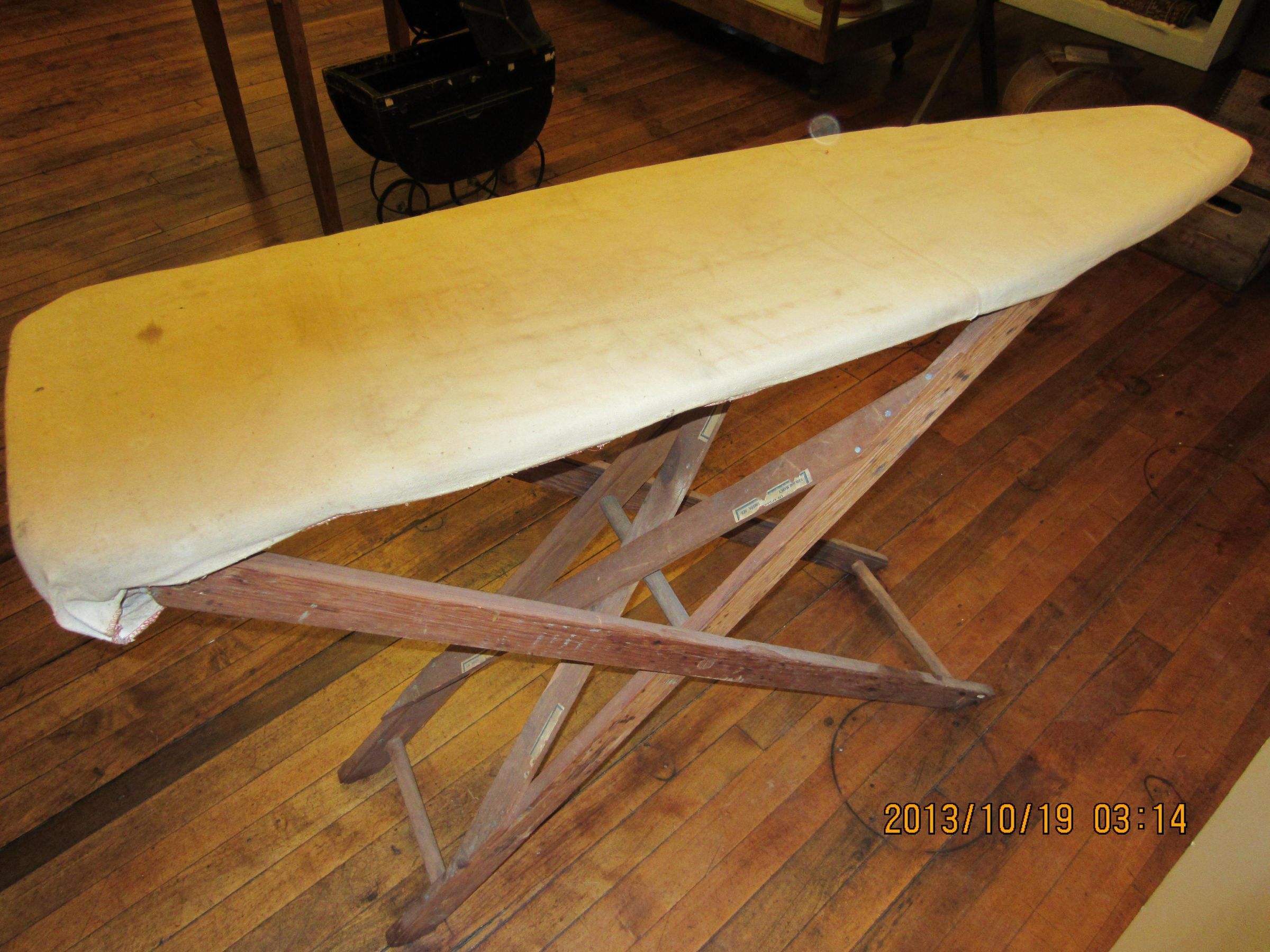 Folding wooden frame opens to support in table position a board measuring 51 1/2 inches x 14 inches tapering to 5 1/2 inches. Board is padded with several thichnesses of fabric and stands 35 1/4 inches from floor.