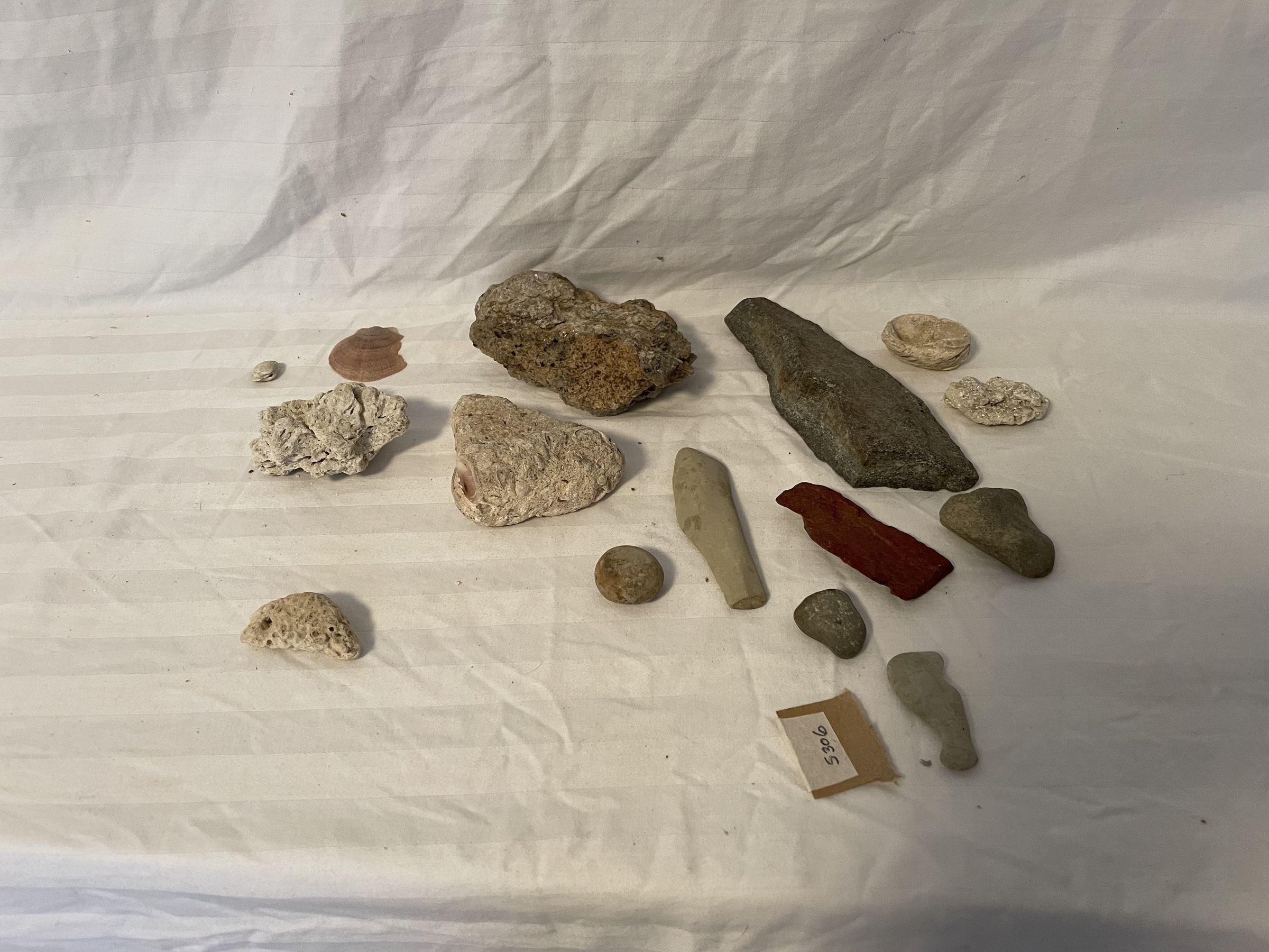 A collection of fifteen rocks, minerals, sheets, concretions, and coral. There are also several shells and fossils.