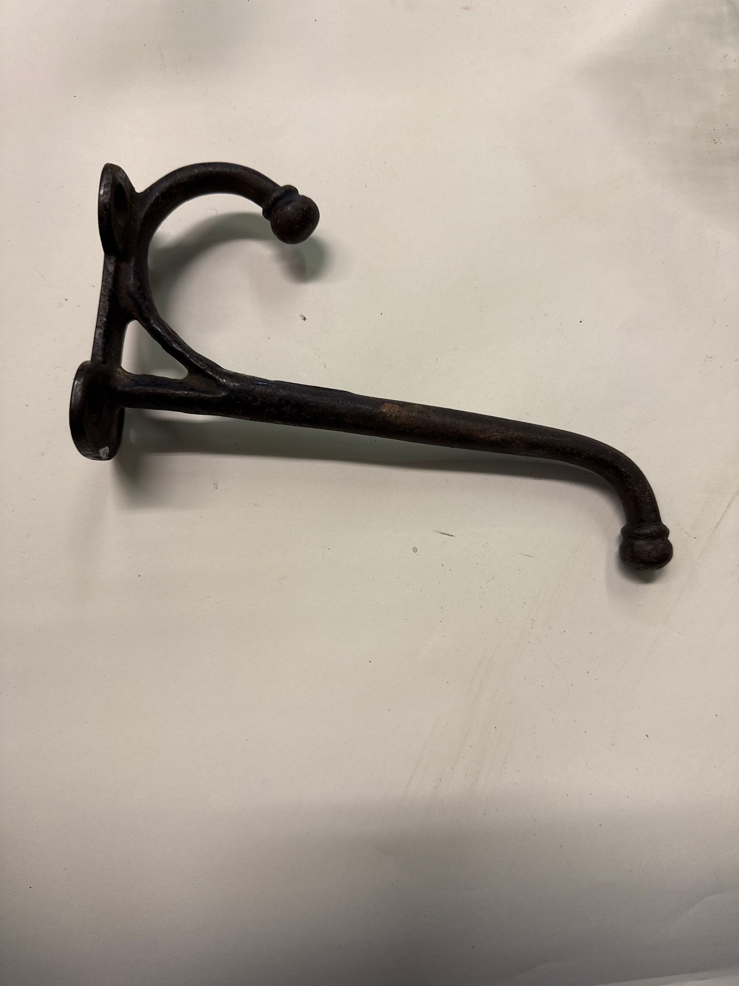 8 inches x 3 3/4 inches x 2 1/2 inches. Hooks made of round metal, one 8 inches long and the other 2 1/2 inches long. Each hook has a knob on the end. The other end is attached to a flat piece of metal that would be mounted flush on the wall. There are 4 holes for mounting.