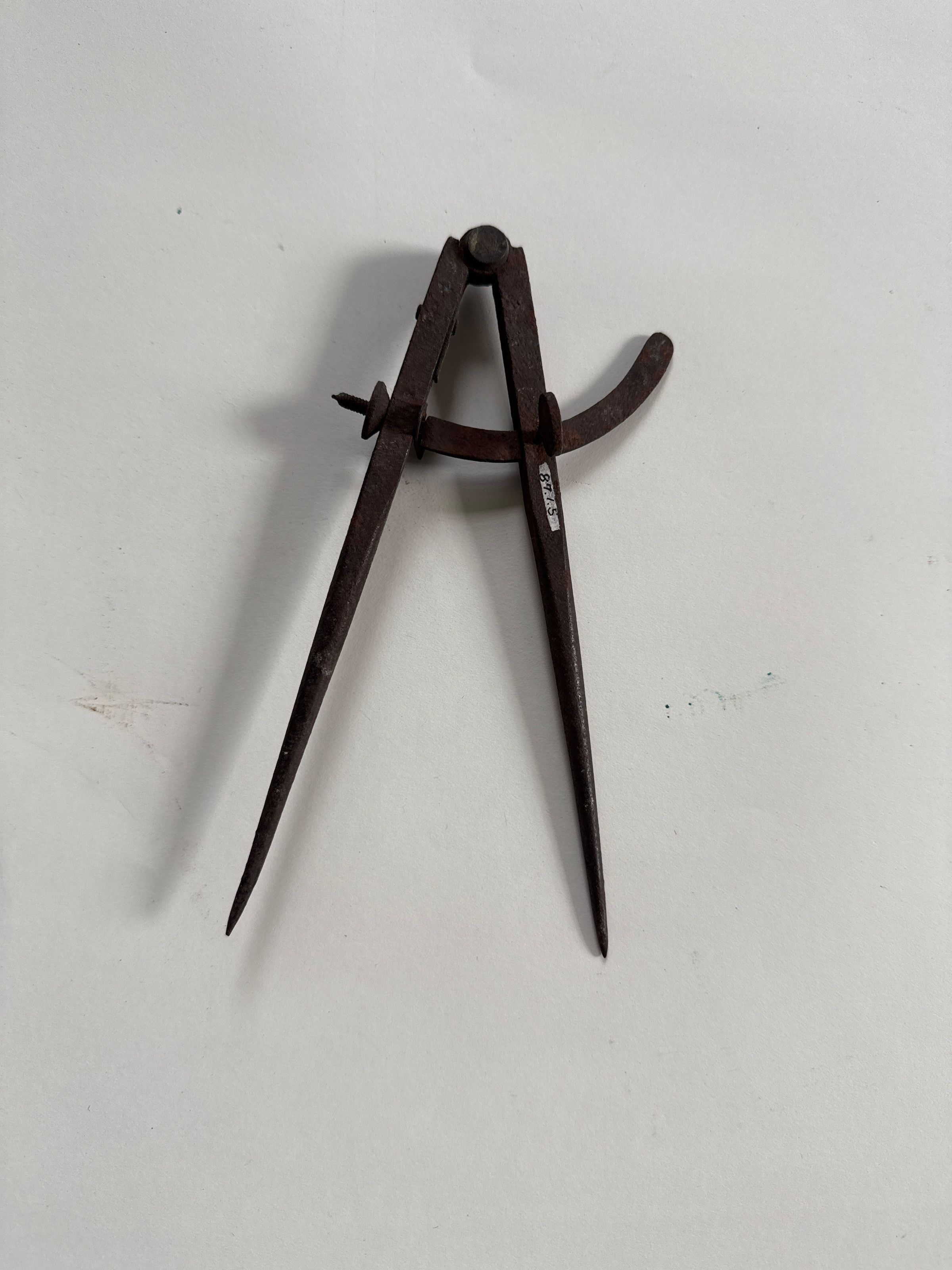 Two 7 inch pointed metal legs, joined with hinge at top. Two inches below top slots hold a 3 inch curved metal strip 1/4 inch wide, threaded at one end for holding screw. Width between points of divider may be adjusted by means of loosening and tightening a screw attached to one leg.