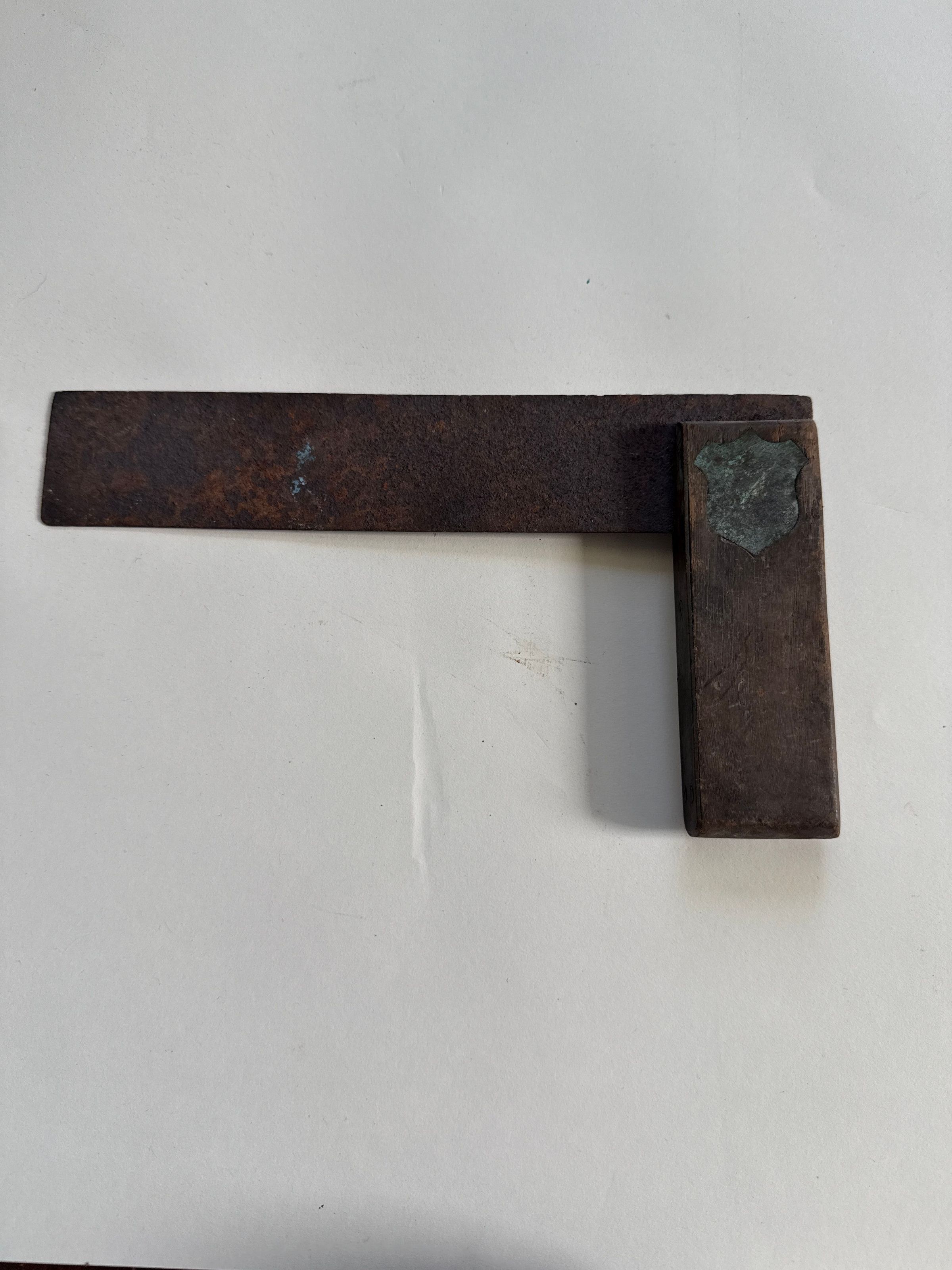 Flat metal strip 9 3/8 inches x 1 3/4 inches fits at right angles into wooden piece measuring 4 3/4 inches x 1 1/2 inches x 3/4 inch. A thin metal strip on one long side of this piece is attached to the wood by five screws. On either side of the wooden piece a shield-shaped design is inlaid.