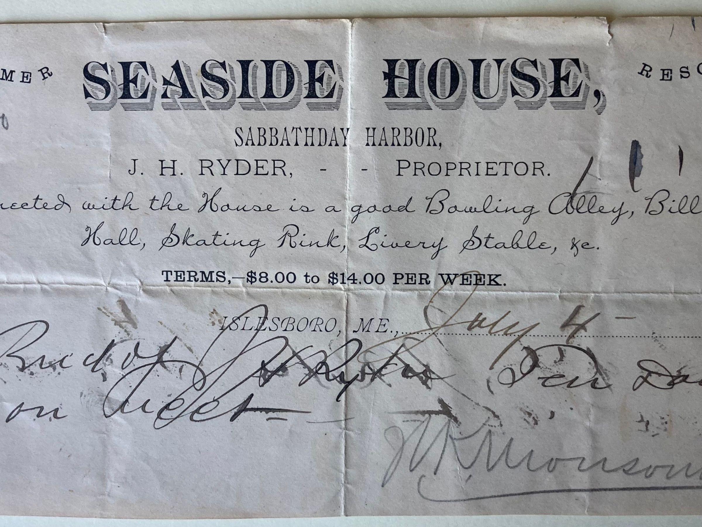 Receipts from Seaside House, Mason & Hall, Penobscot Bay & River Steamboat Co., Harbor & Gate Towing, Charles H. Quimby, F.S. Pendleton & Co.