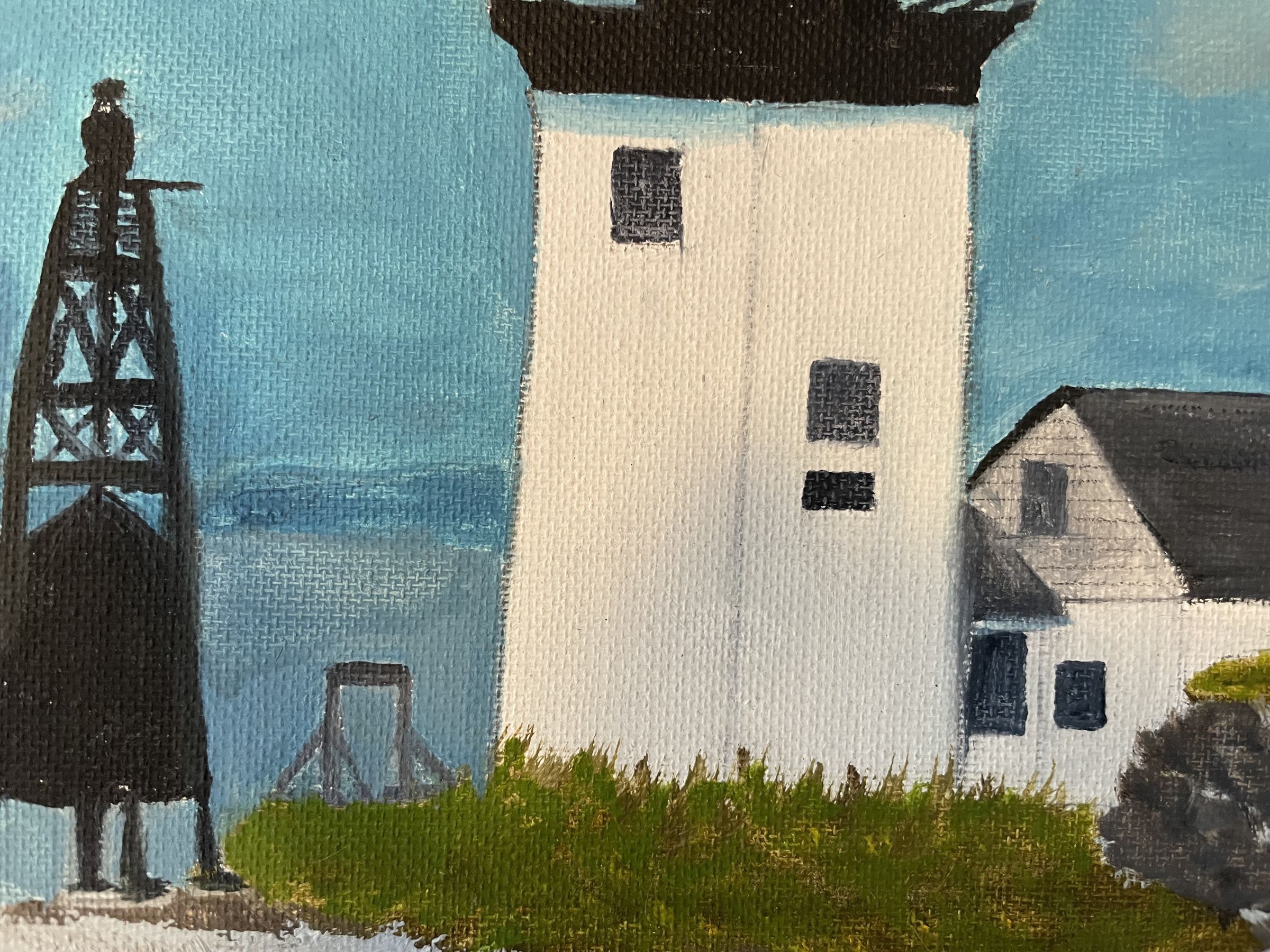 A framed painting of the Grindle Point Lighthouse, referenced from a postcard image that is taped to the back.