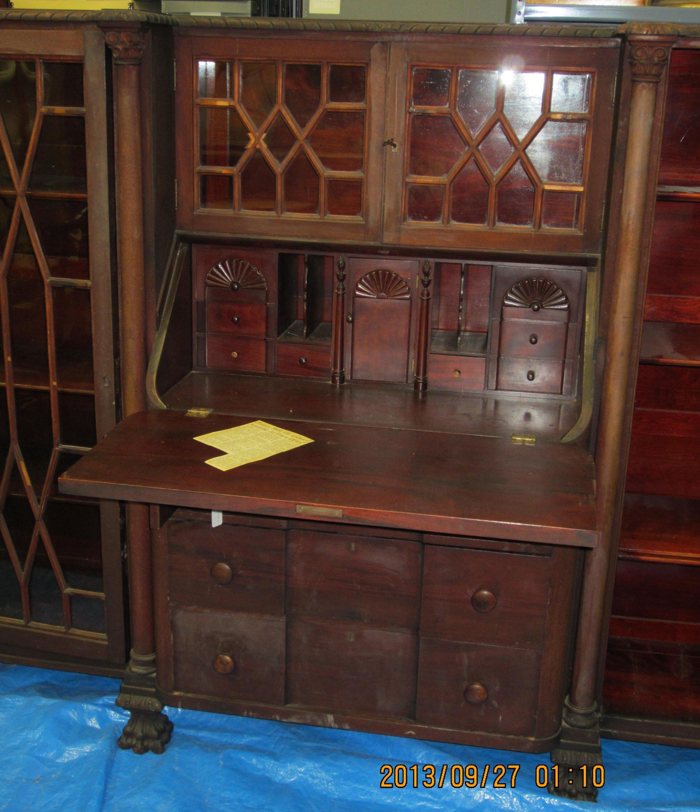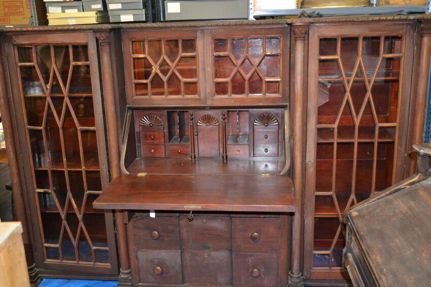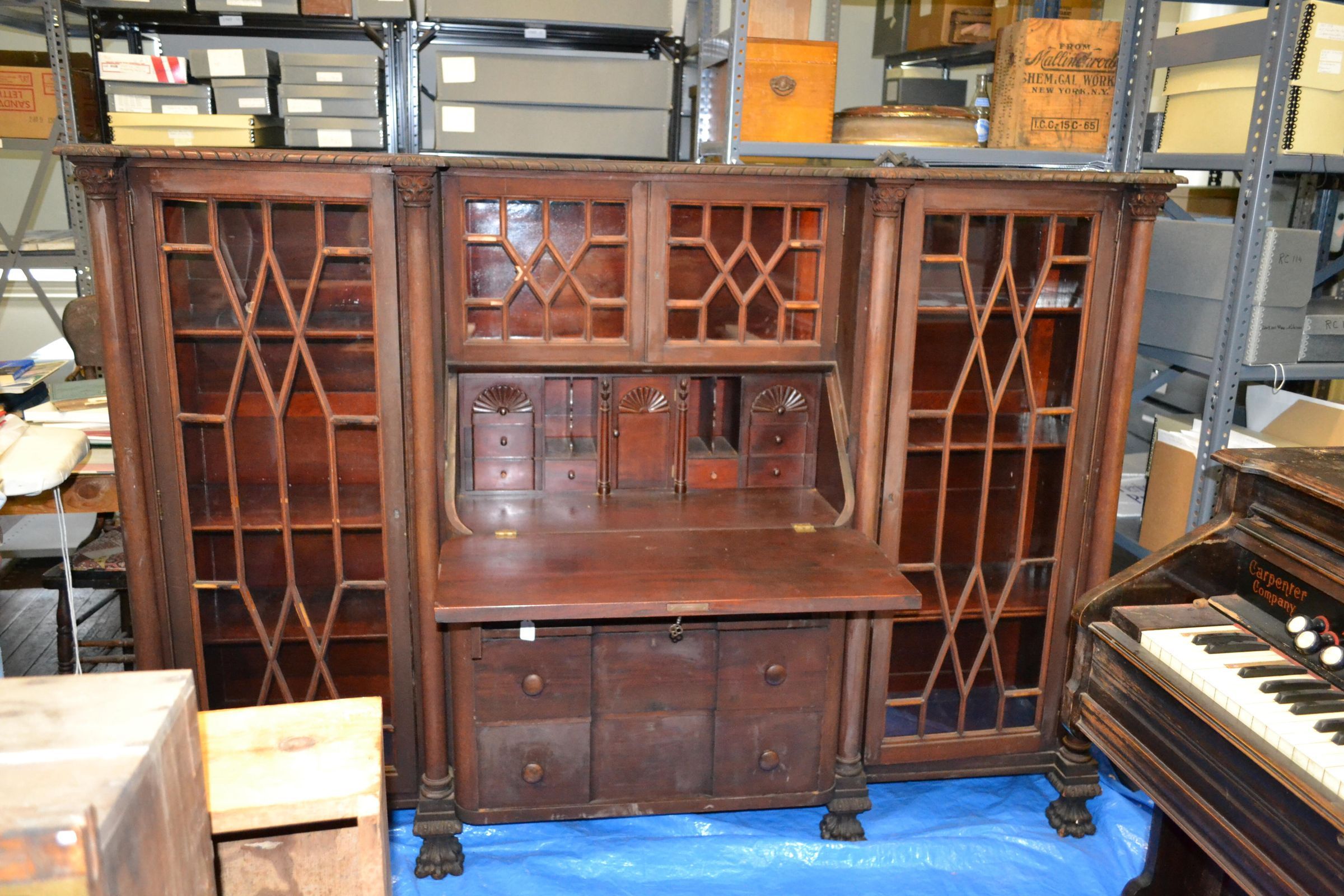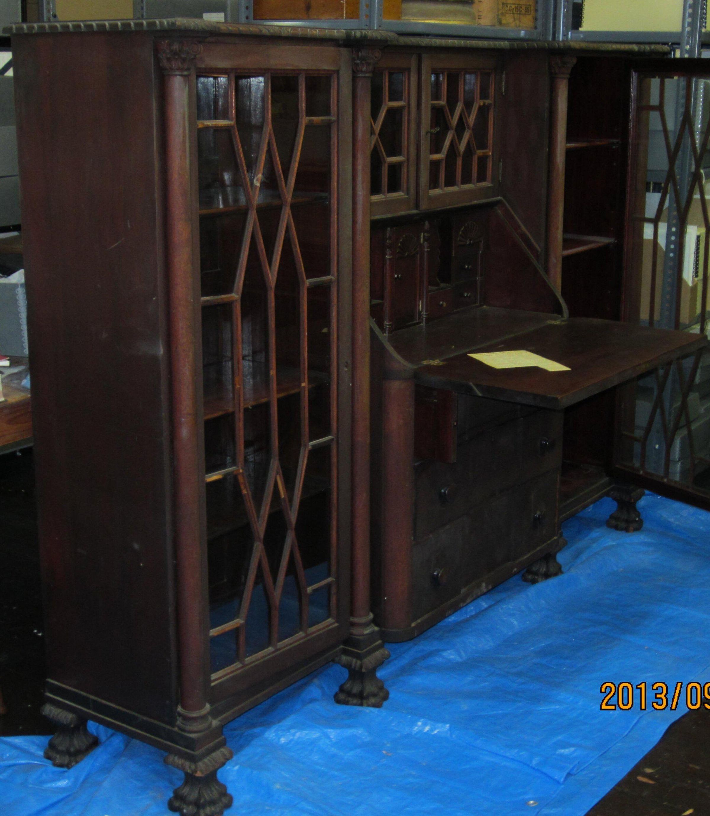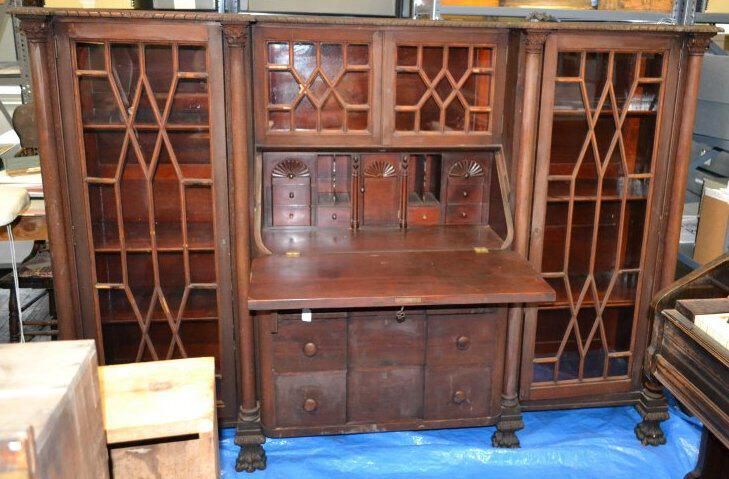Center section 31 1/2 inches x 56 1/2 inches. Three drawers beneath drop-front have wooden pulls. Dropfront open reveals eight small drawers, four pigeonholes and larger storage space with a door. Above desk is section with two glass doors. Glass is sectioned by decorative wood moldings. On either side of desk are sections measuring 25 inches x 56 1/2 inches holding four adjustable shelves covered by glass doors over which decorative pieces of wooden molding have been attached. On either side of doors are columns topped with carved design. Eight claw-footed legs 5 1/4 inches x 4 inches support the whole piece. The top connecting the 3 sections is 80 inches.