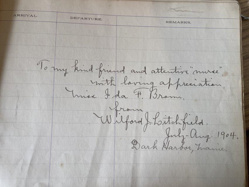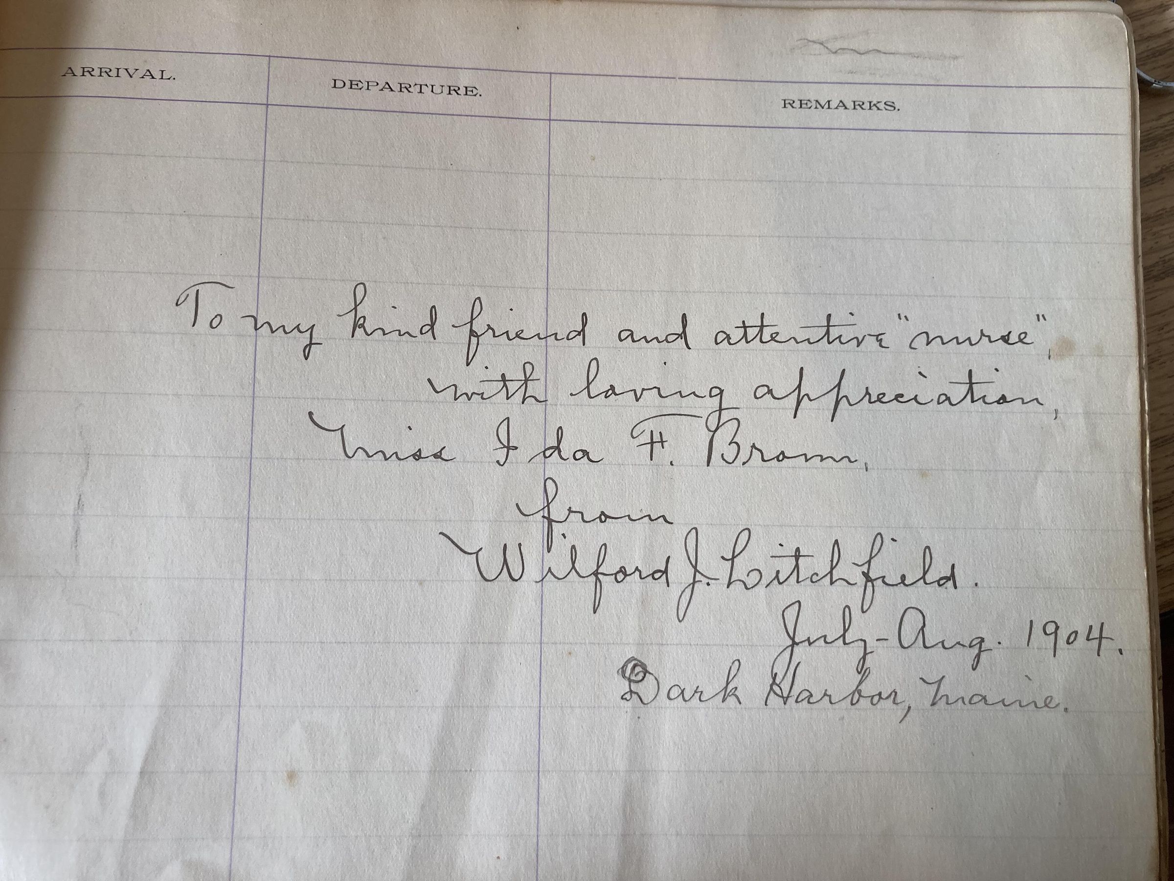 "To my kind friend and attentive 'nurse,' with love and appreciation, Miss Ida F. Brown, from Wilford J. Litchfield, July-Aug. 1904, Dark Harbor, Maine"