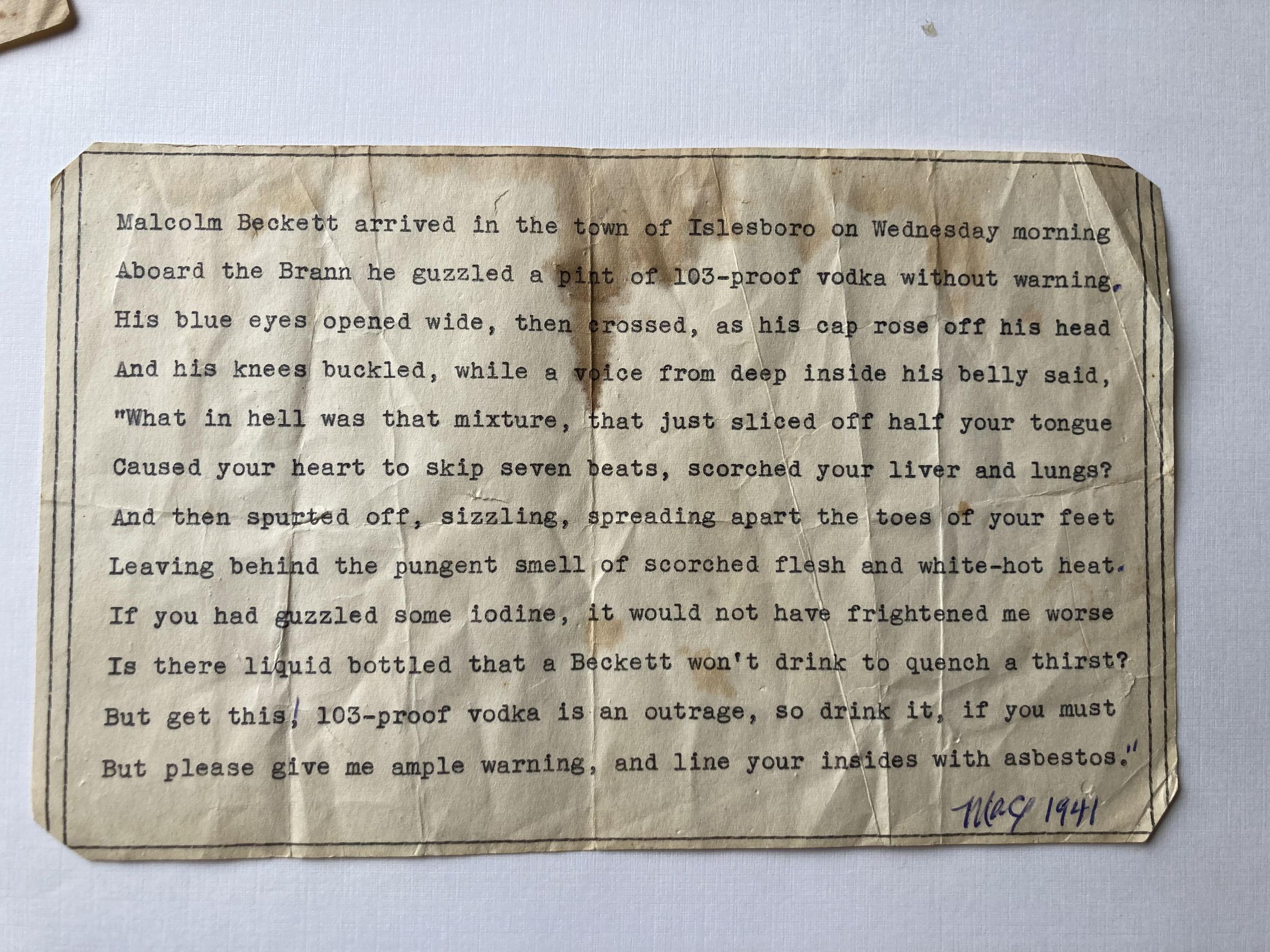 Humorous printed piece (cut from a newspaper perhaps?) about Malcolm Beckett drinking 103 proof vodka.