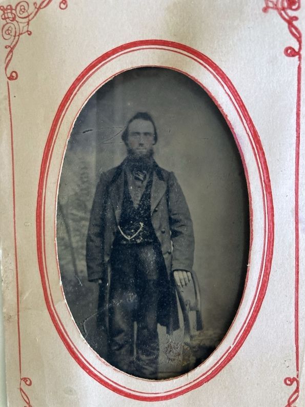 Tintype portrait of an unidentified man in middle age. Dark bearded, he stands formally in the photographer's studio, one hand resting on the back of a chair. He wears a frock coat. His waistcoat and trousers are of darker material, and his boots are lighter-colored. His watch chain is prominently displayed. Possibly Civil War era? Found in the Atterbury-Moody correspondence.