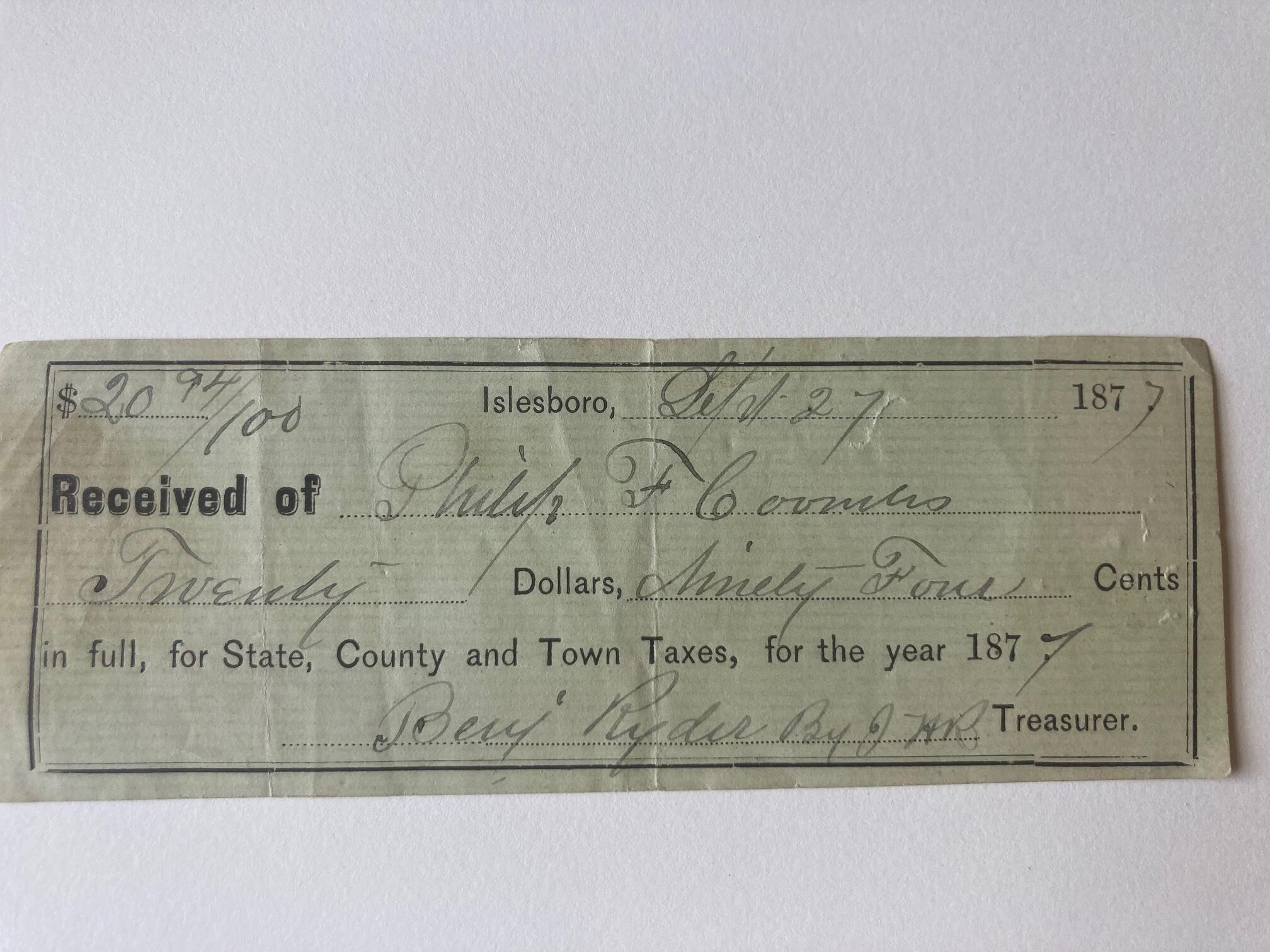 Receipt for payment by Philip F. Coombs in the amount of twenty dollars and ninety four cents in full for state, county and town taxes for the year 1877.