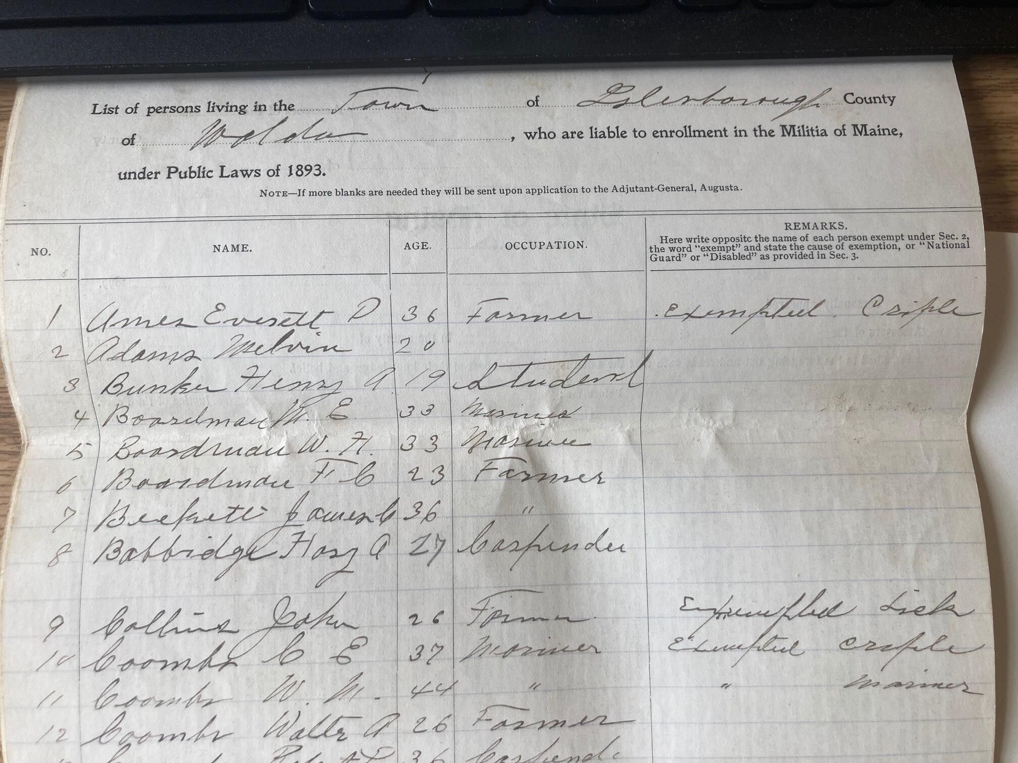 List of persons living in the town of Islesborough liable to enrollment in the Militia of Maine, April 29, 1899, sworn before John Pendleton Farrow, Justice of the Peace