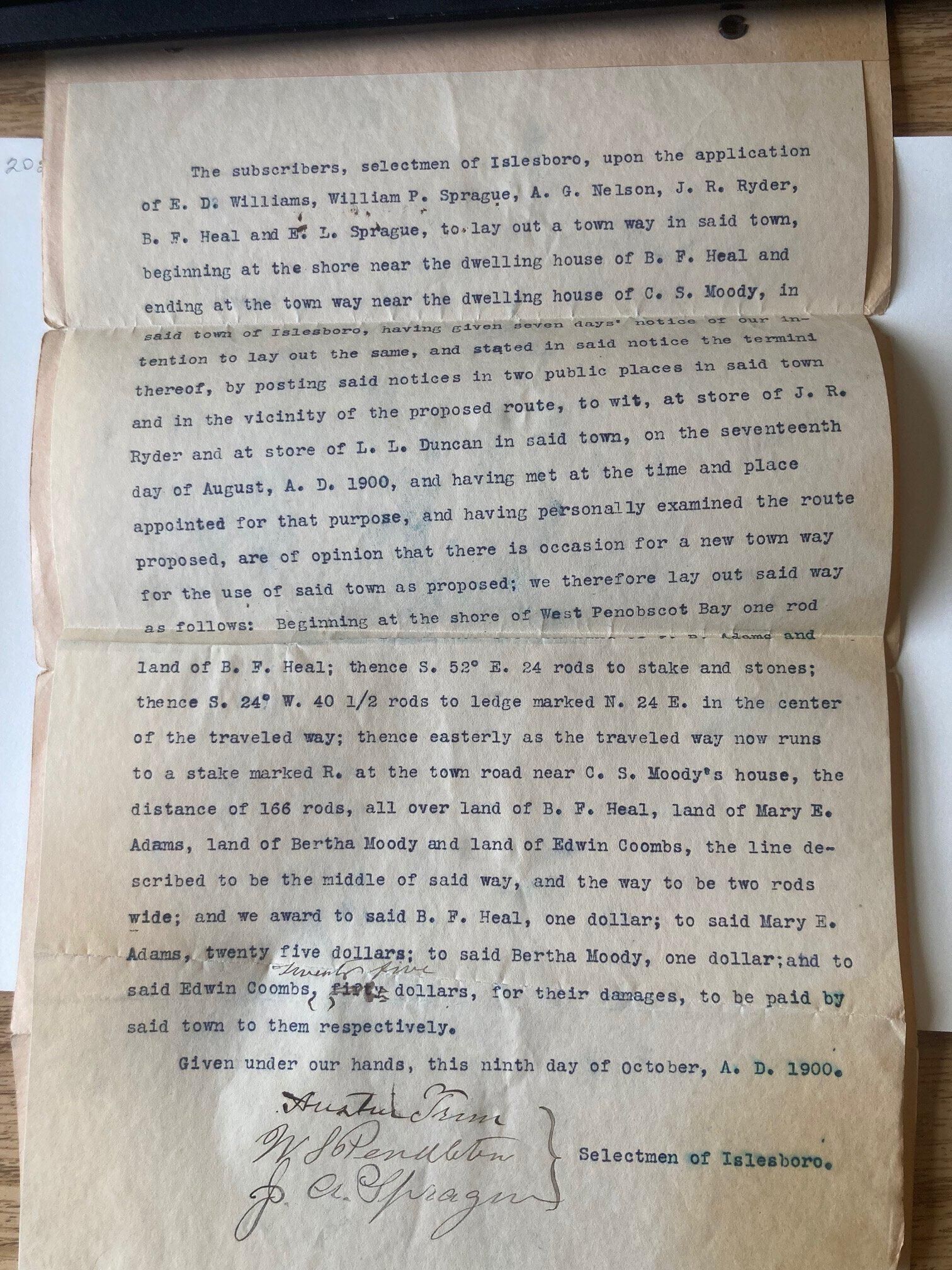 Agreement for the laying out of a new town way, "beginning at the shore near the dwelling house of B. F. Heal and ending at the town way near the dwelling house of C. S. Moody." Signed October 9, 1900, by Selectment of Islesboro.