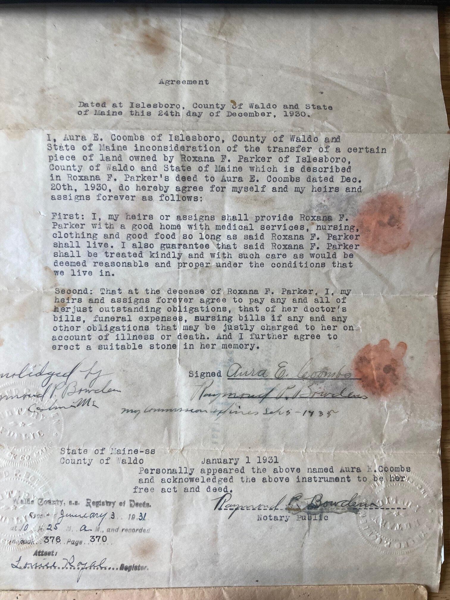 Agreement dated at Islesboro, County of Waldo and State of Maine, December 24, 1930, regarding transfer of a piece of land owned by Roxana F. Parker to Aura E. Coombs in return for a "good home with medical services, nursing, clothing and good food so long as said Roxana F. Parker shall live."
