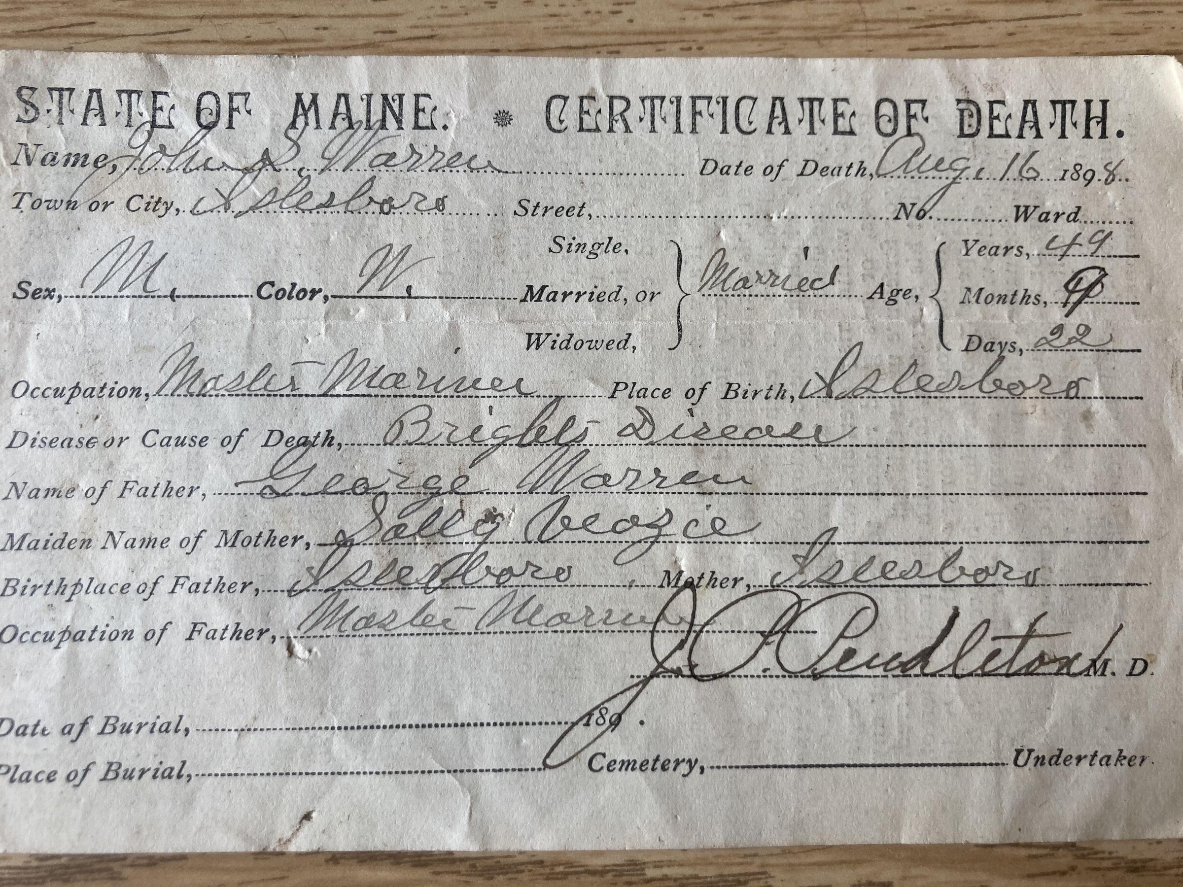 State of Maine Certificate of Death John S. Warren, August 16, 1898