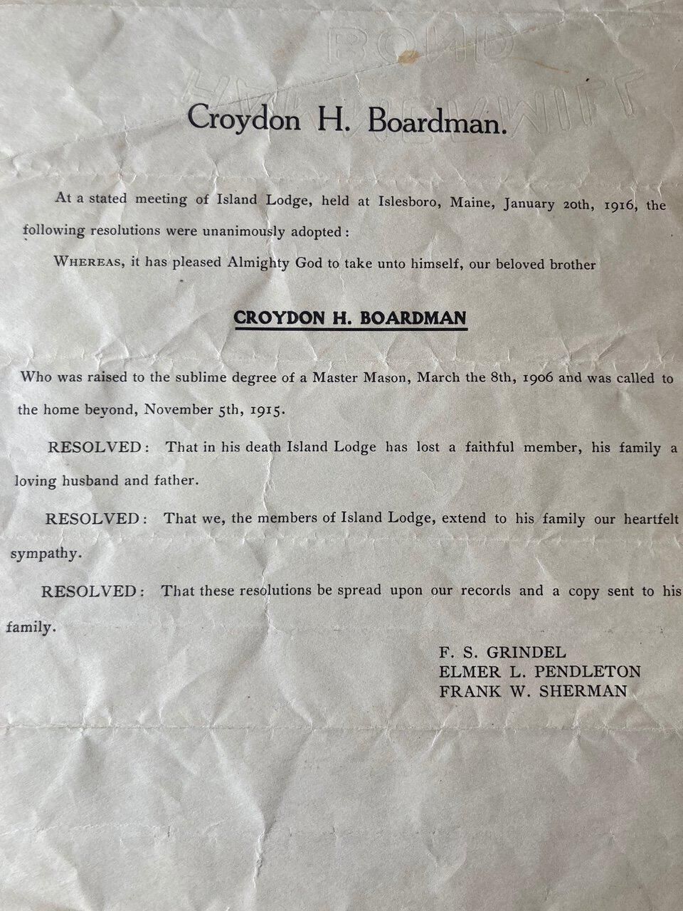 Resolutions of the Island Lodge of Masons honoring Croydon H. Boardman and extending heartfelt sympathy to his family following his death on November 5, 1915. The meeting adopting the resolutions was held on January 20, 1916.