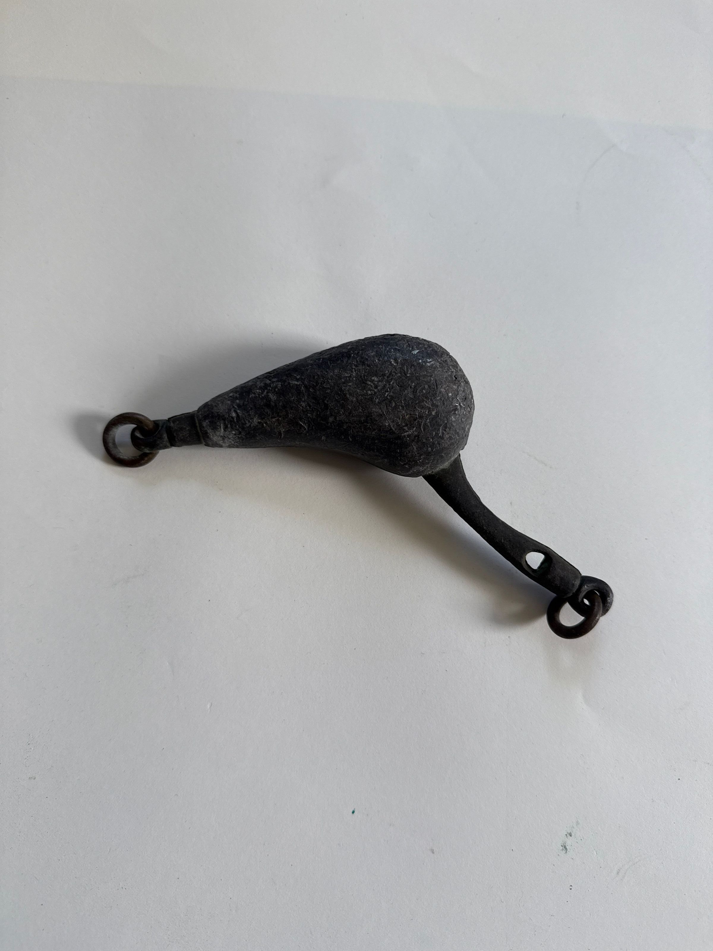 4 inch weight has ring attached at one end. Other end has 2 1/2 inch handle with small hole near end and another ring.