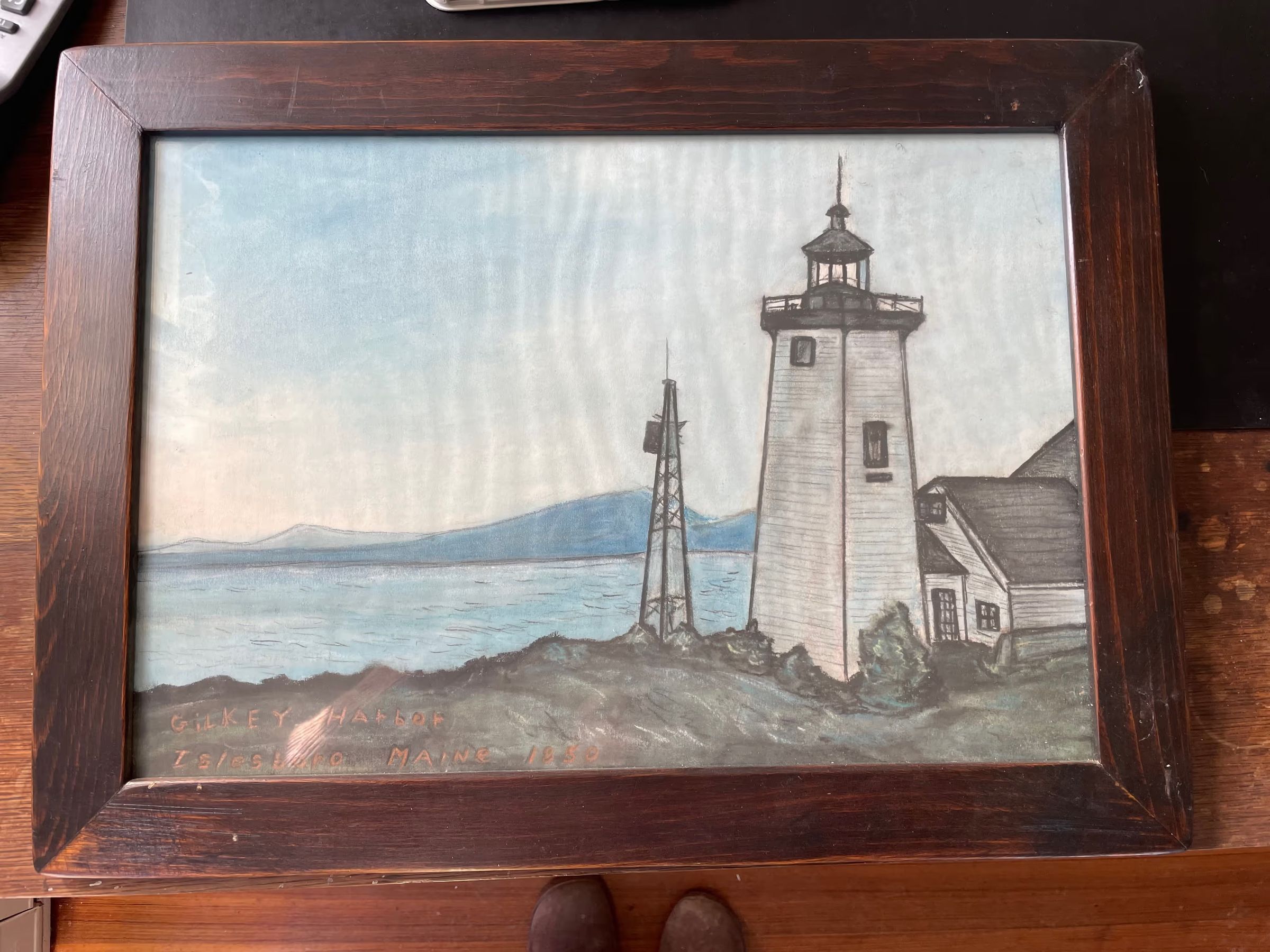 Charcoal and colored pencil art work of the Grindle Point Lighthouse, Southern perspective. Reads "Gilkey Harbor. Islesboro, Maine 1850" at the bottom. The date refers to when the lighthouse was built, not when the artist completed this work. Artist unknown