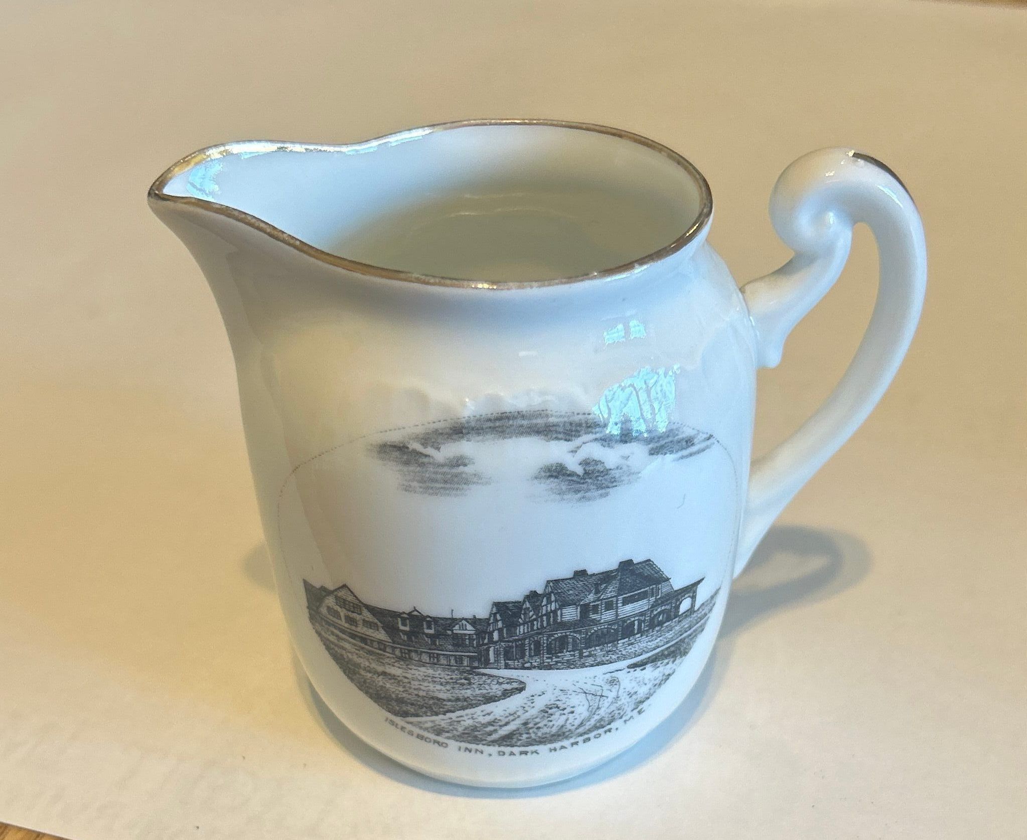 White ceramic pitcher measuring 3 1/2 inches high, 2 inches in diameter, with handle. Picture in black of first Islesboro Inn is shown on side. Rim and handle are decorated in gold.