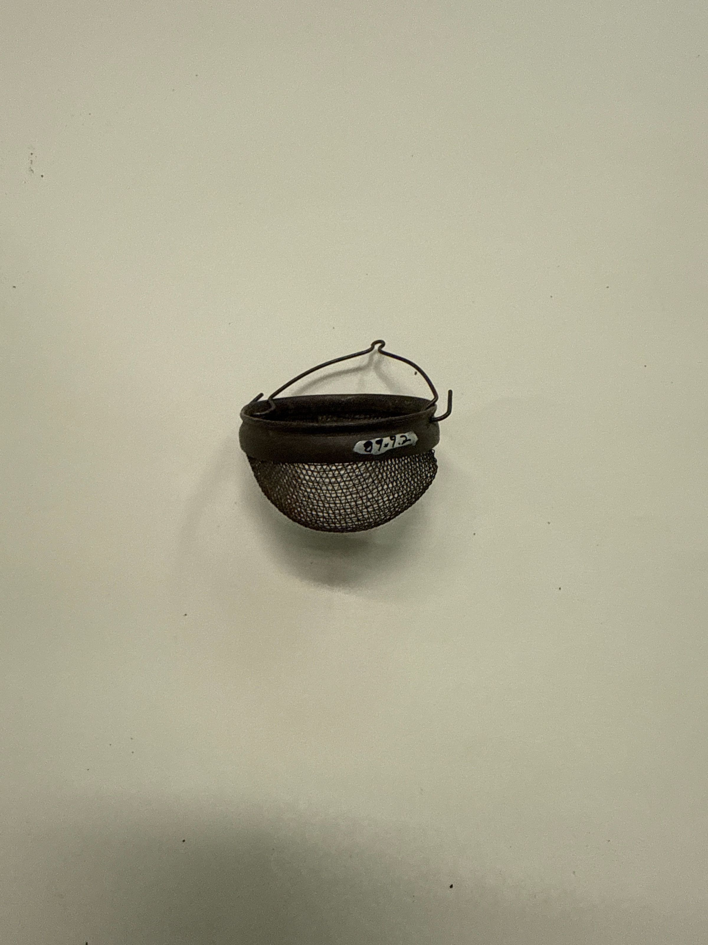 Round tea strainer 1 3/4 inches in diameter, 1 inch deep, mesh small. Has metal hanger inserted in rim with separate metal wire attached to handle for hanging.
