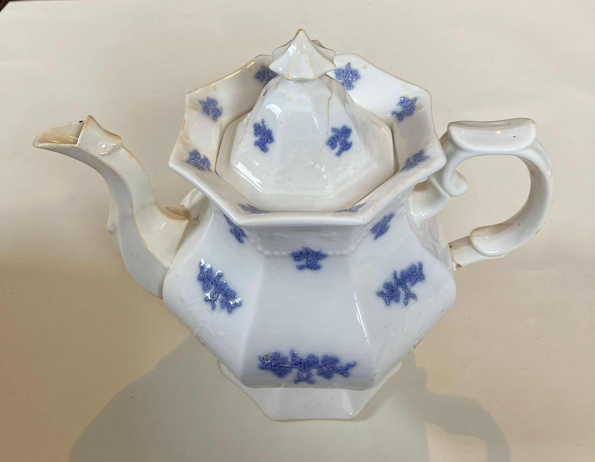 Large, 10 inch high teapot. White with grape vines and bunches of grapes in blue decorating pot and lid. No makers mark or country of origin which I think dates it prior to 1890s.