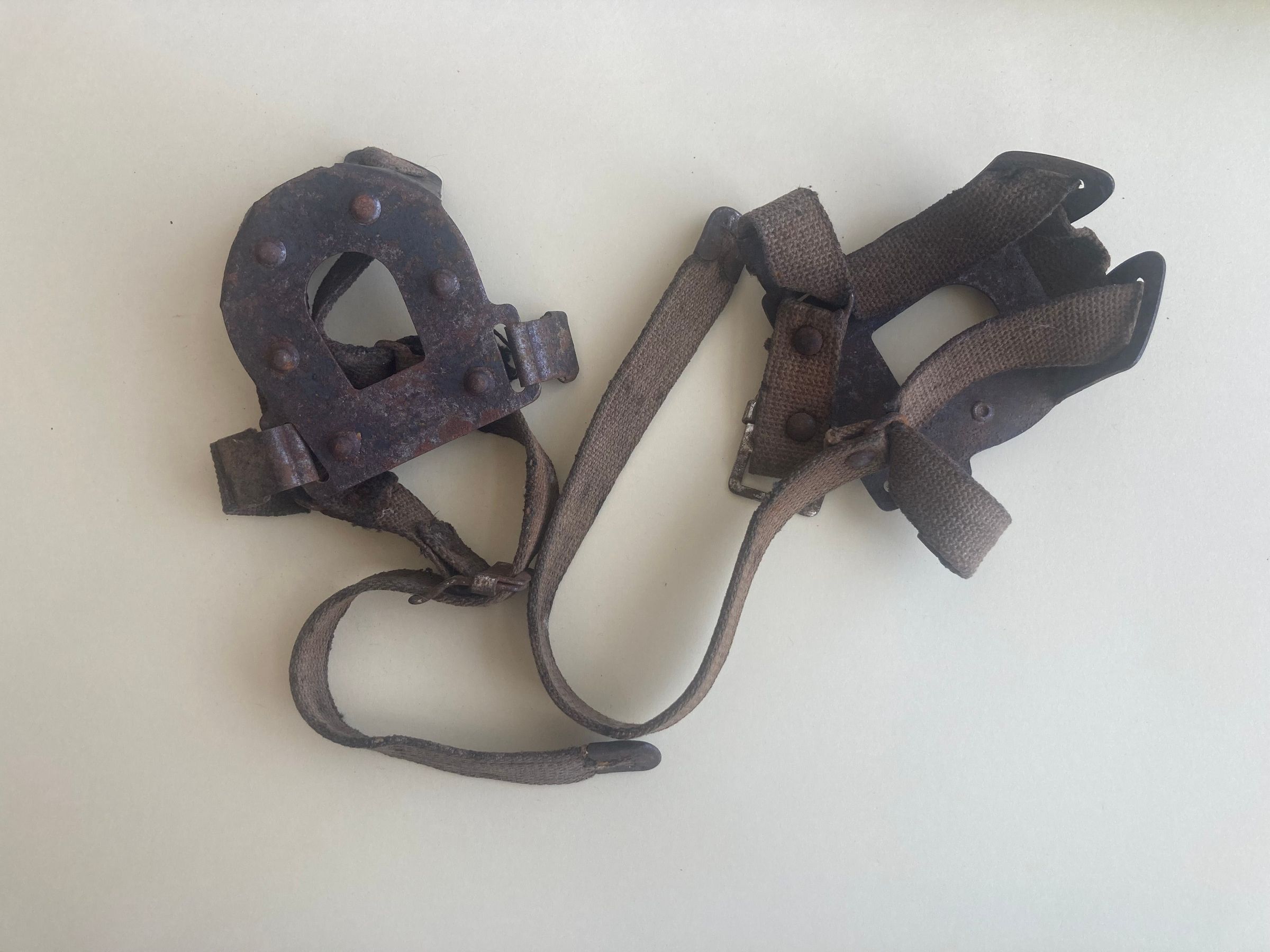 Small pair of ice grips to strap on the heel of shoes or boots, metal studs and canvas straps.