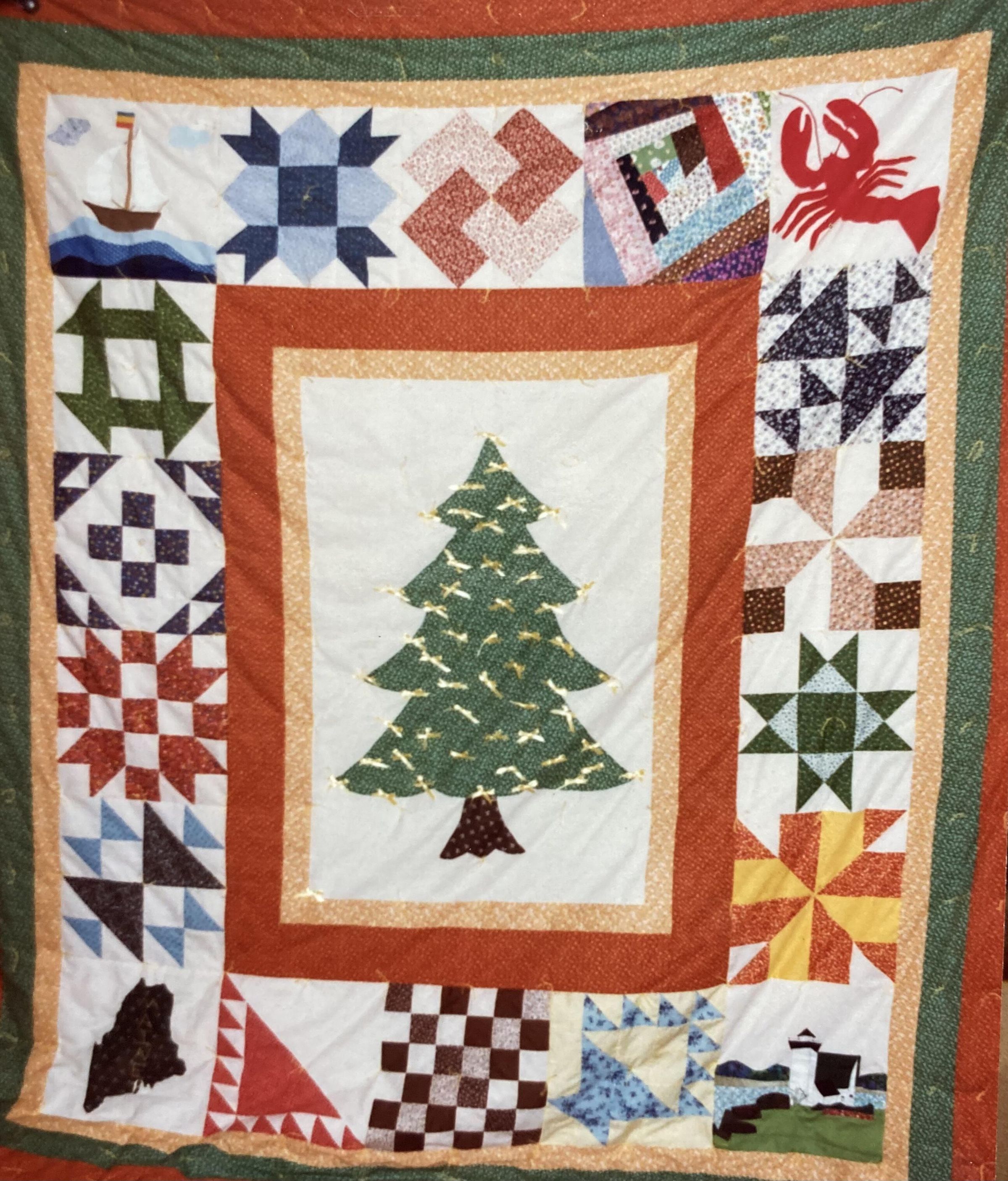 Three photographs pertaining to the Richard Queen quilt. One of the finished quilt, and two of the women who made it. Quilters identified: Mildred Willis, Eva Pendleton, Dorothy Pisciotta, Mary Durkee, Connie Leach, Myra Rolerson.