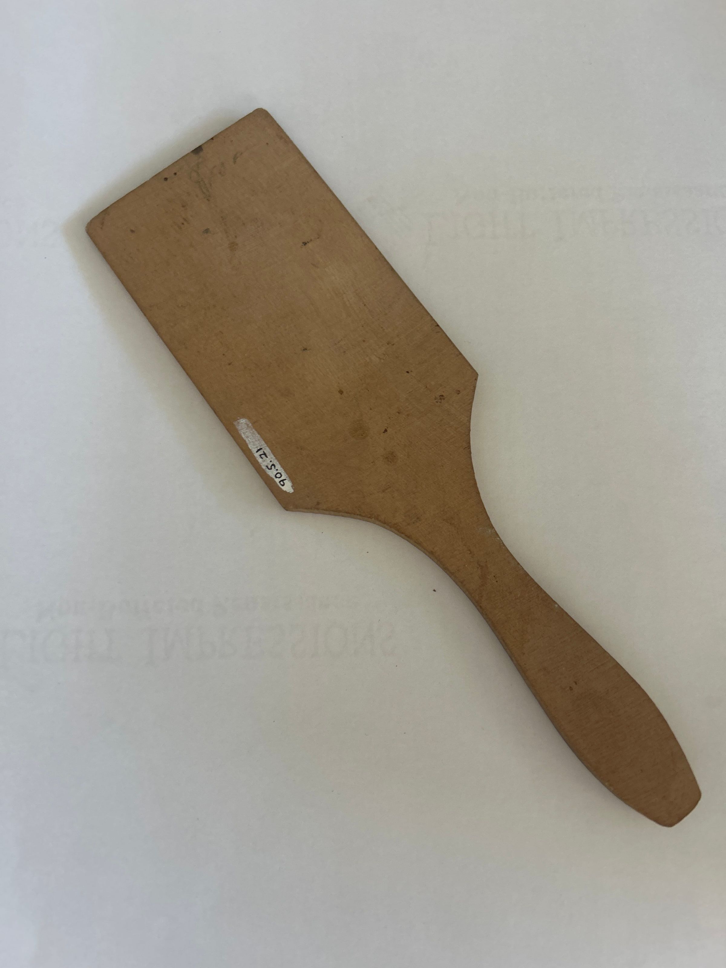 Piece of wood shaped into paddle measuring 10 inches overall including handle. Paddle part is 4 3/4 inches long x 3 inches wide. Both sides are smooth.