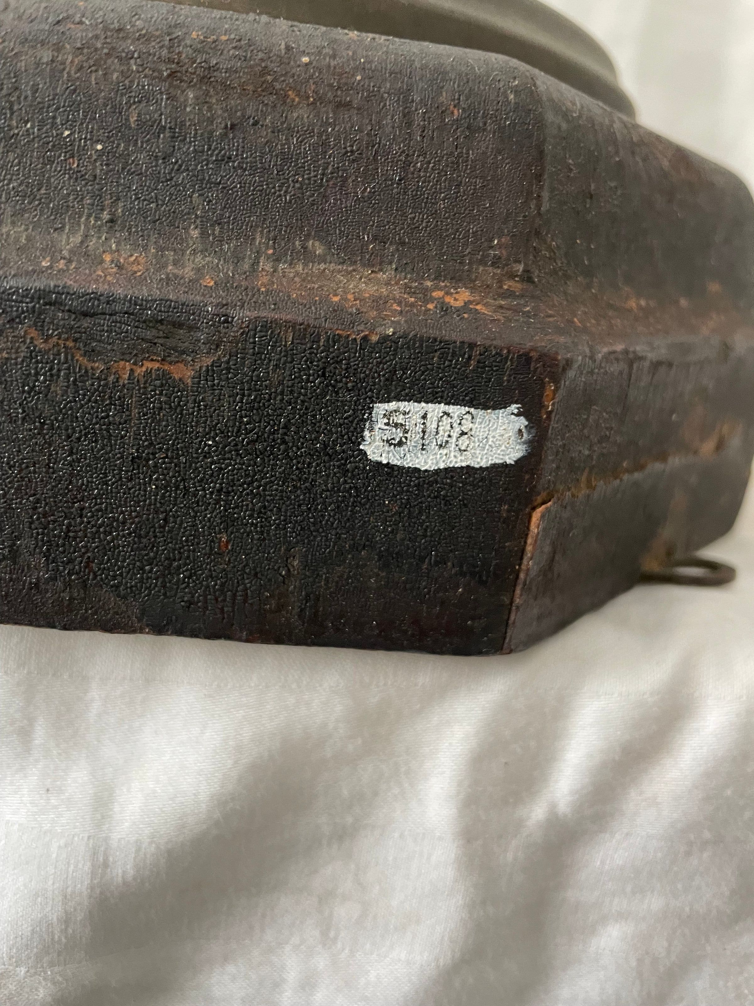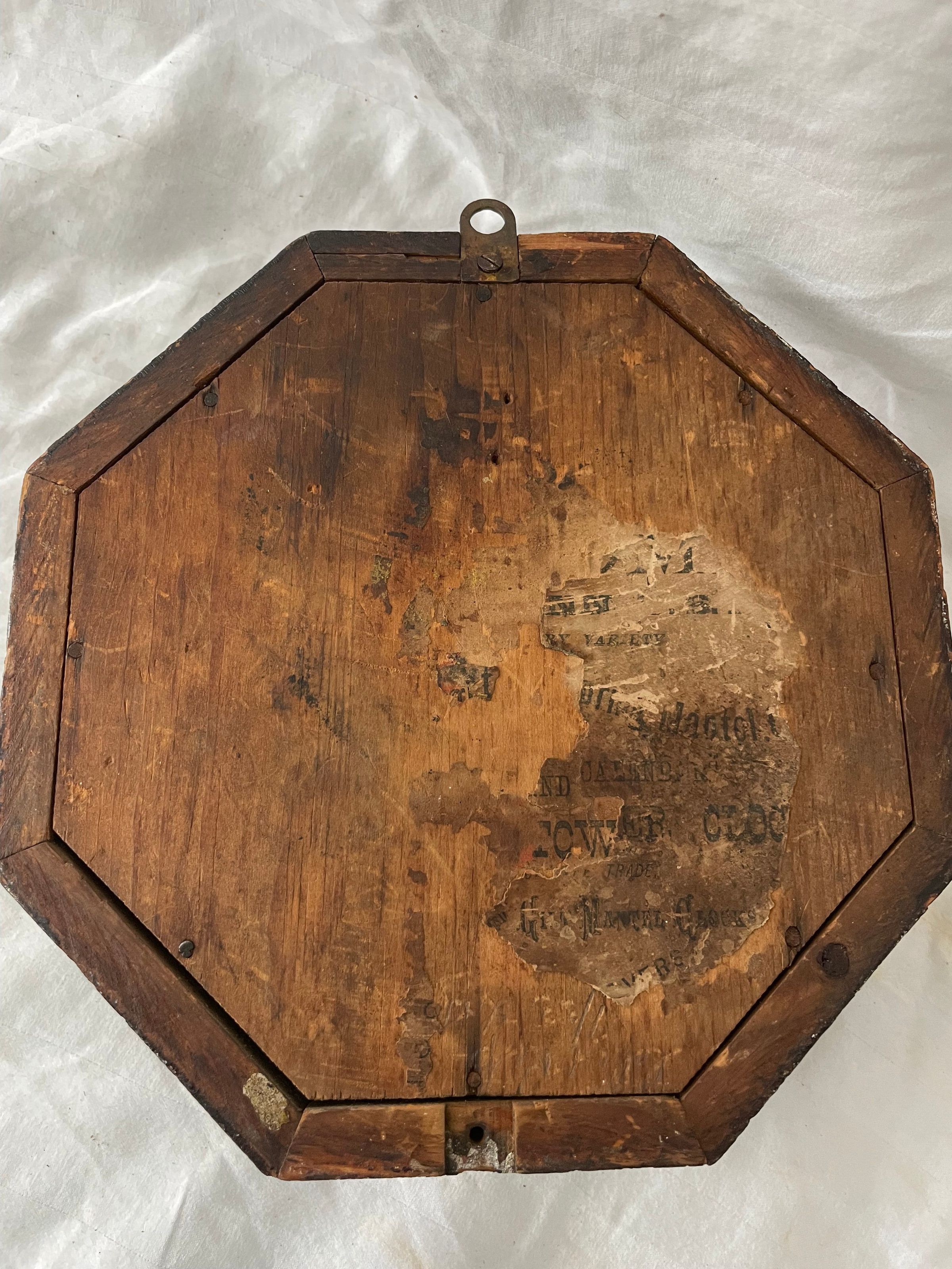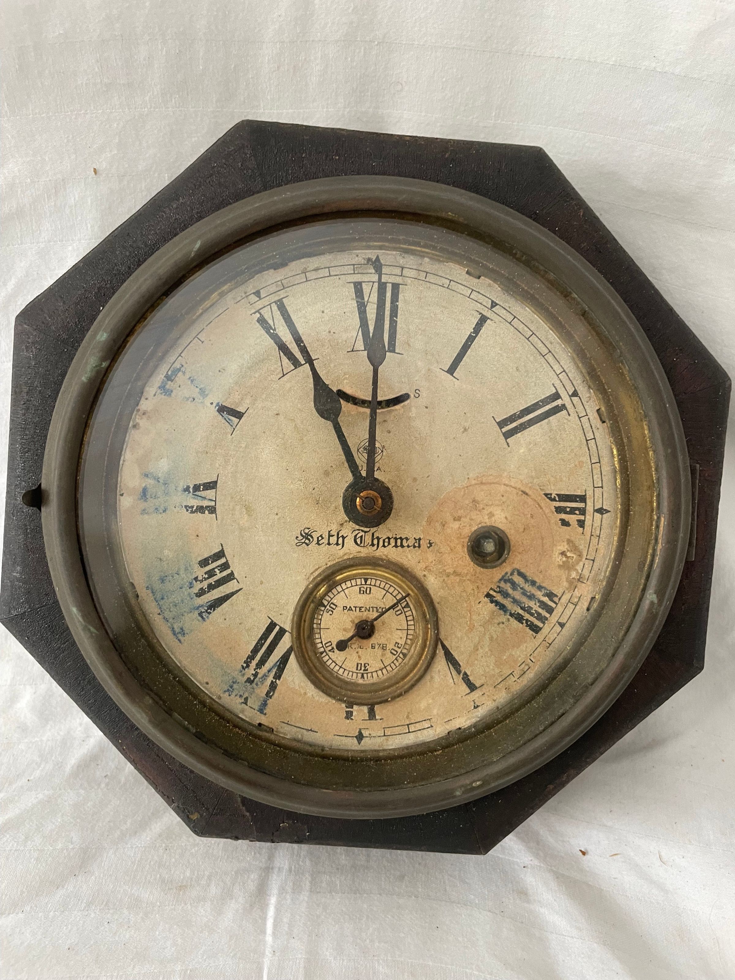 A wooden cased Seth Thomas Clock. It is a thick wooden octagon shape.