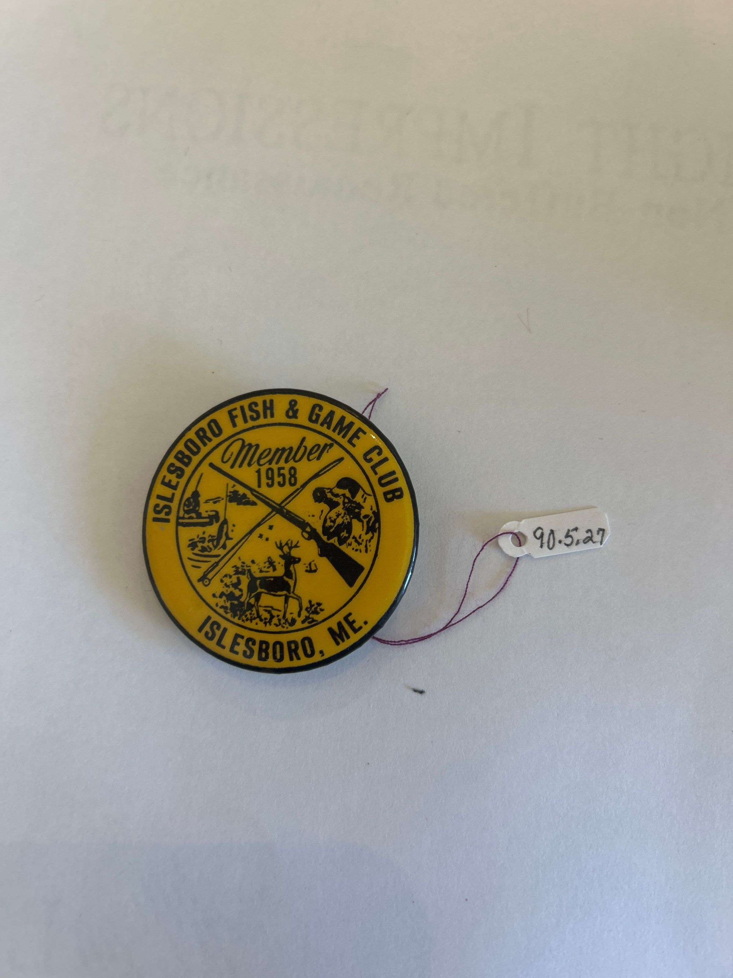 Bottom: ISLESBORO, ME. Within circle shows rifle crossed over fishing rod. Top 1/4: Member 1958; Rt. 1/4: Hunting Dog; Bottom 1/4: Deer with rack;