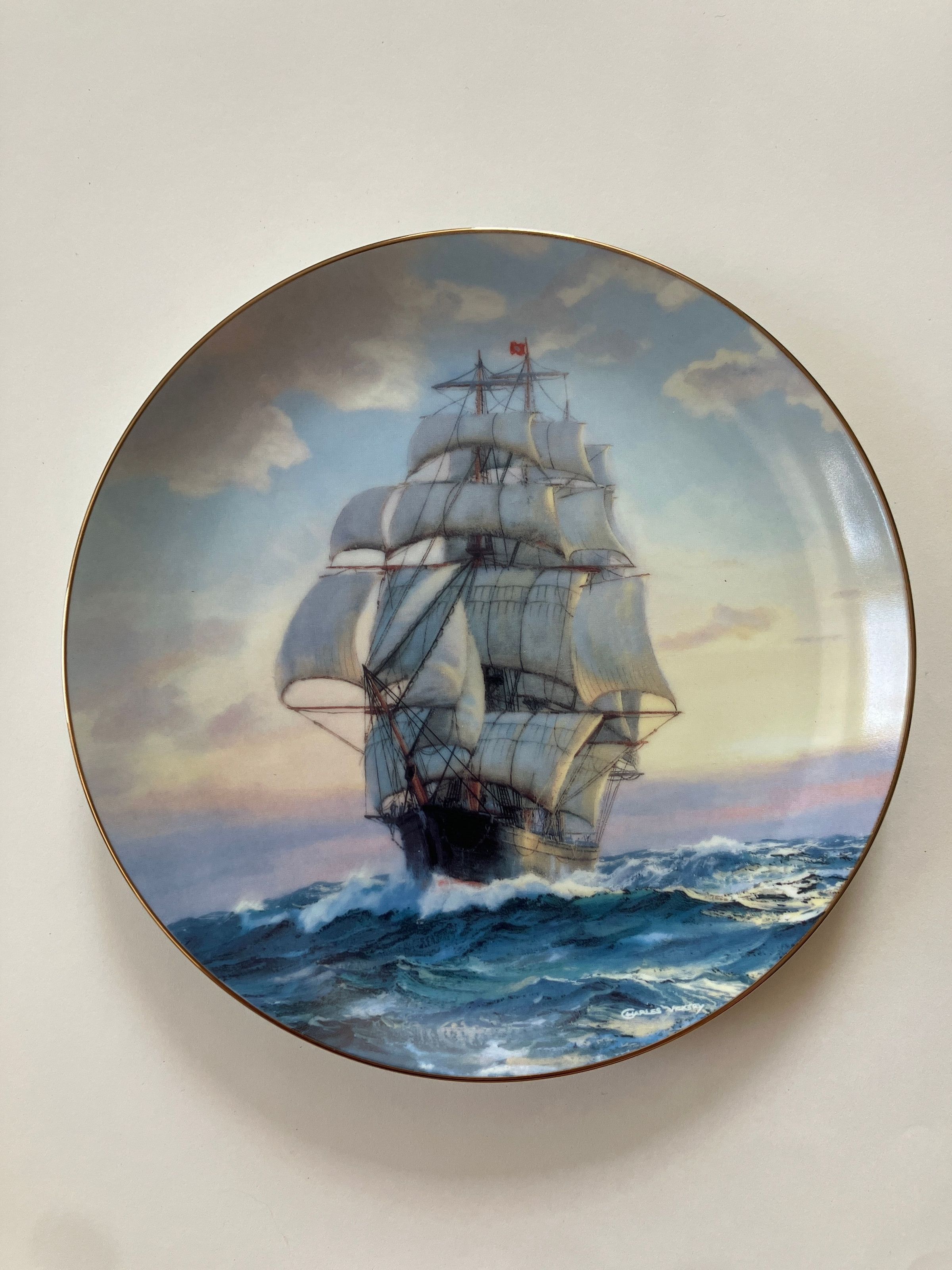 8 1/2 inch plate banded with gold. Pale blue sky with clouds tinged with gray and pink. Sky lighter toward horizon. Clipper ship in full sail on dark blue sea with whitecaps.
