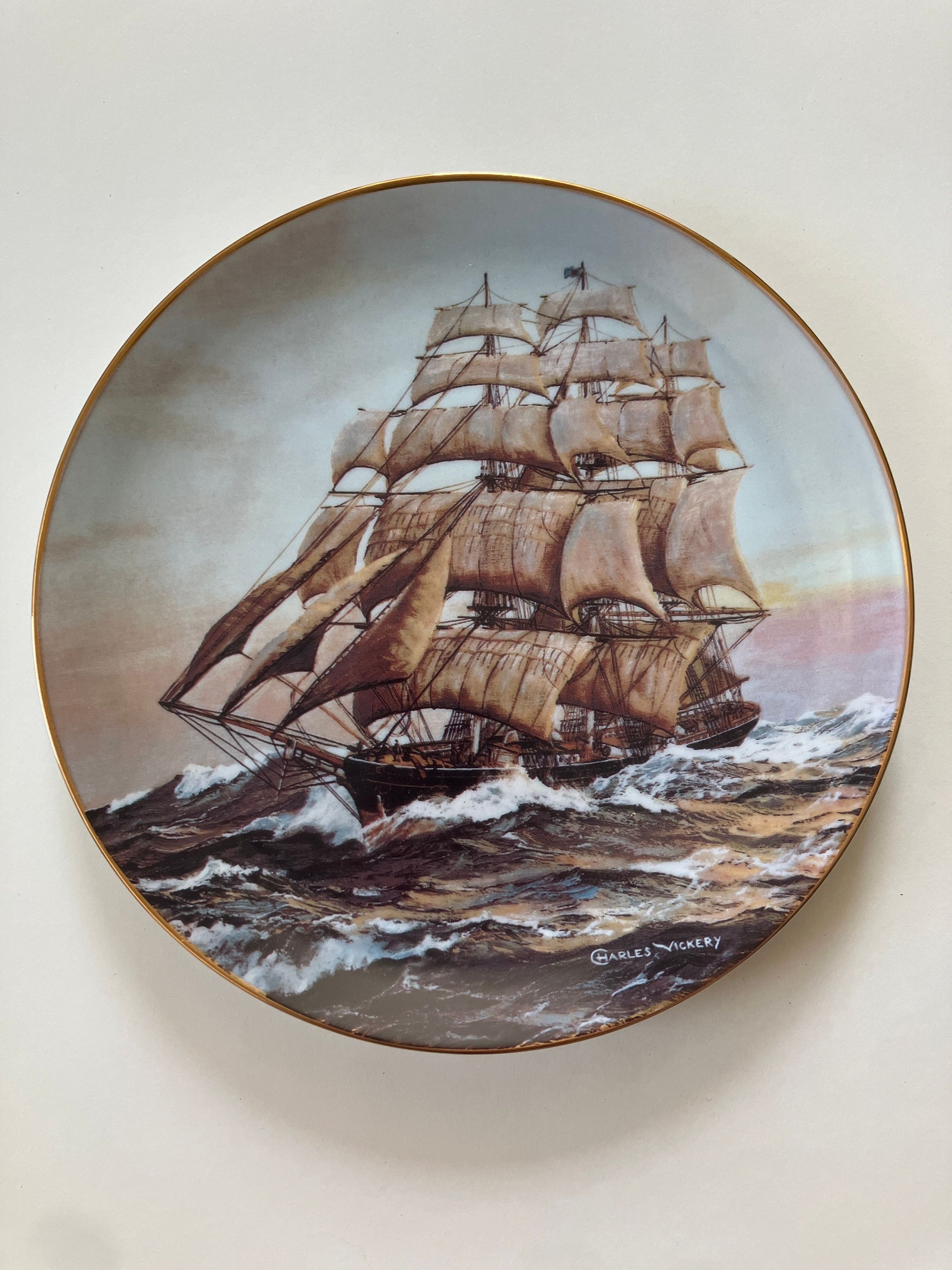 8 1/2 inch plate banded with gold. Pale blue sky with faint, pink glow of daybreak. Dark Clipper Ship on dark, whitecapped sea. Ship in full sail.