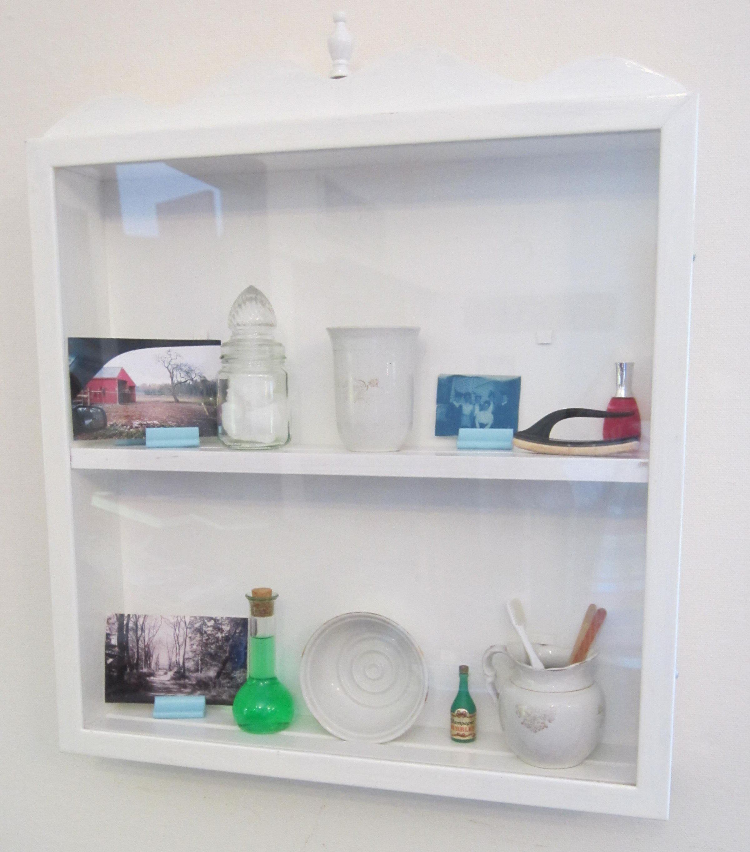 Wooden cabinet painted white 24 inches wide x 28 inches high x 4 3 3/4 inches deep. Two shelves 10 1/2 inches apart have slots to hold items to be displayed. Cabinet has glass front.
