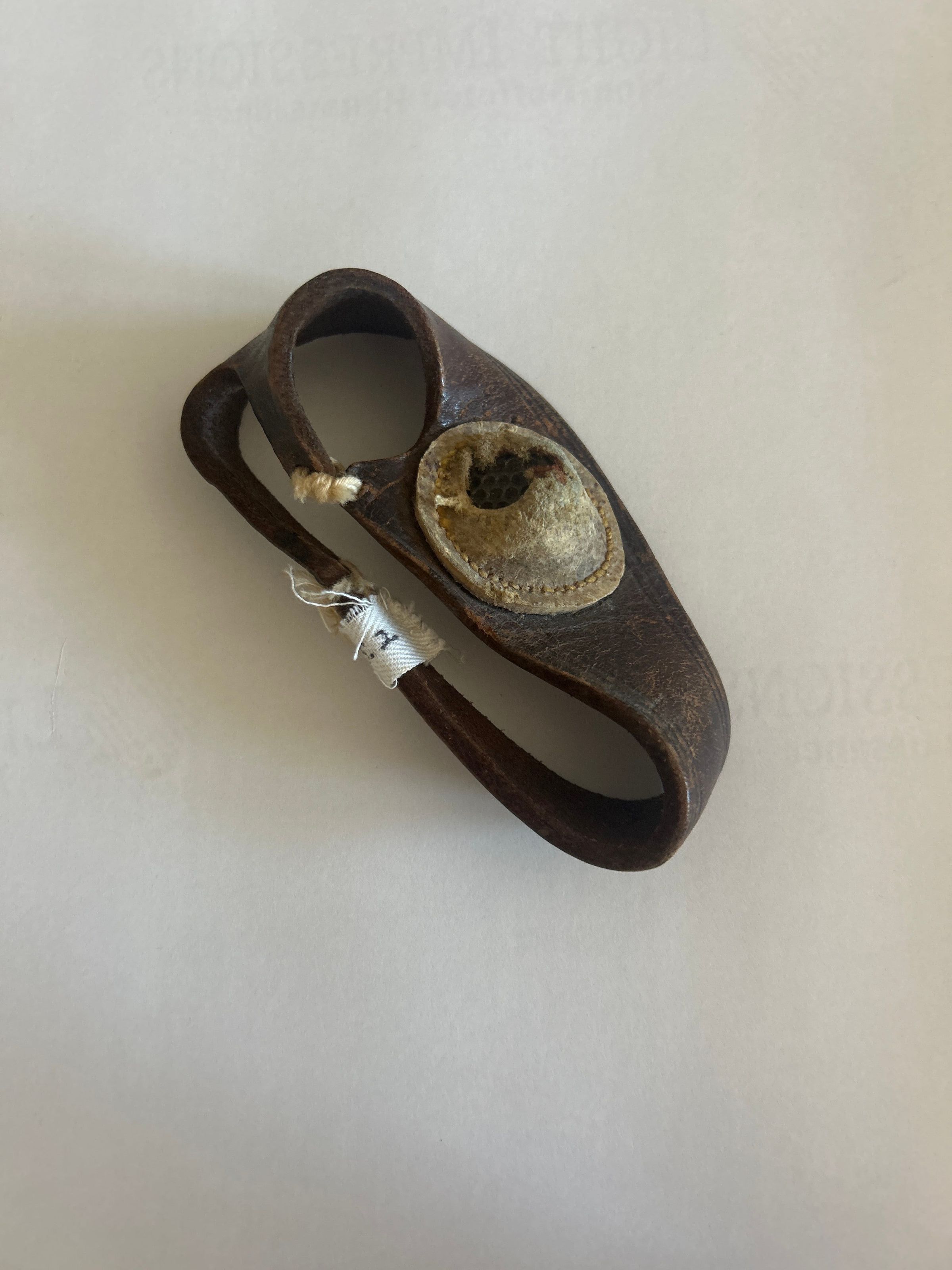 2 inches and fits into the palm of the hand. There is a deep curve cut into part of the palm area, the ends of which are tied together. This area accommodates the thumb. In the palm next to the thumb "hole" is a raised piece of metal containing depressions to accommodate the base of a needle. The metal is attached to the sailor's palm with a closely stitched leather surround. The sailor's palm is used to push a needle through tough cloth, such as canvas.
