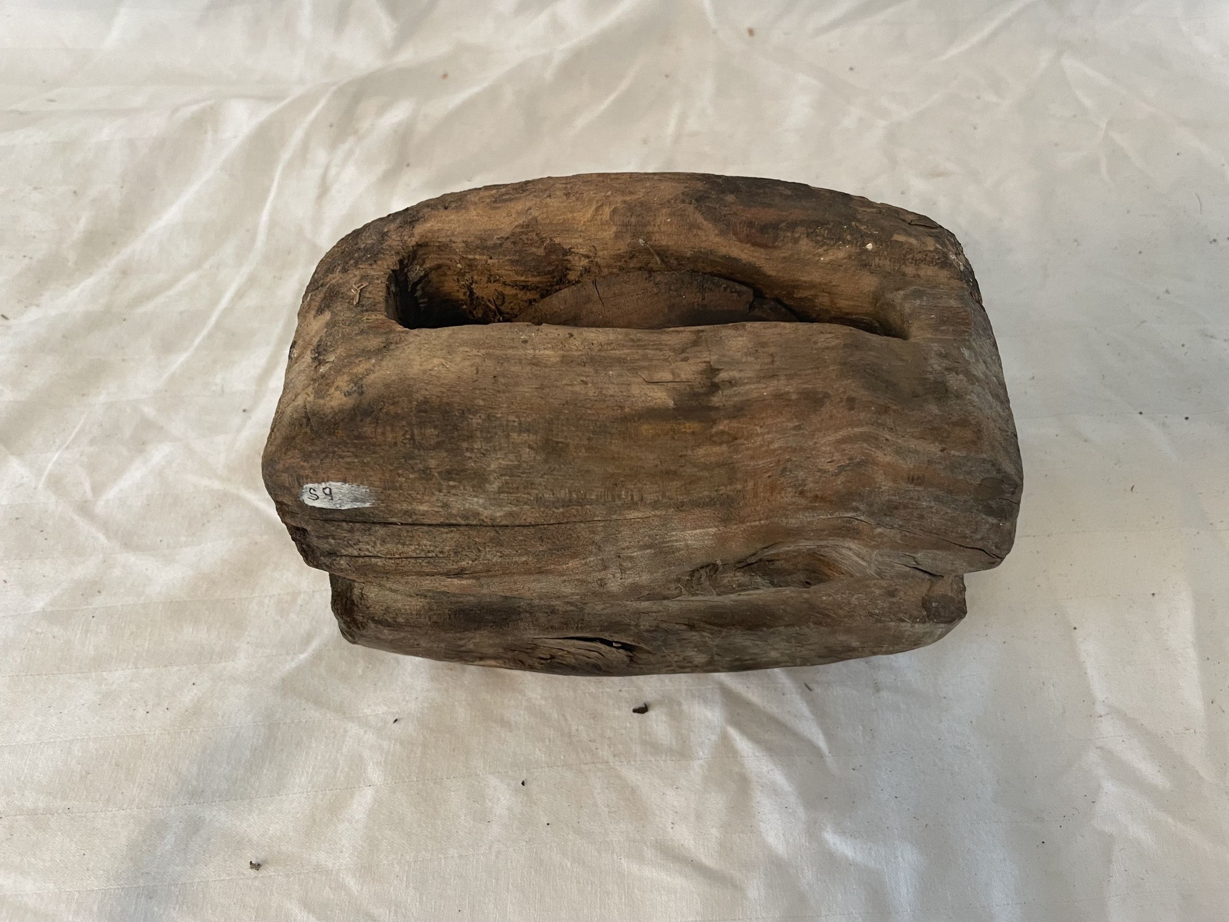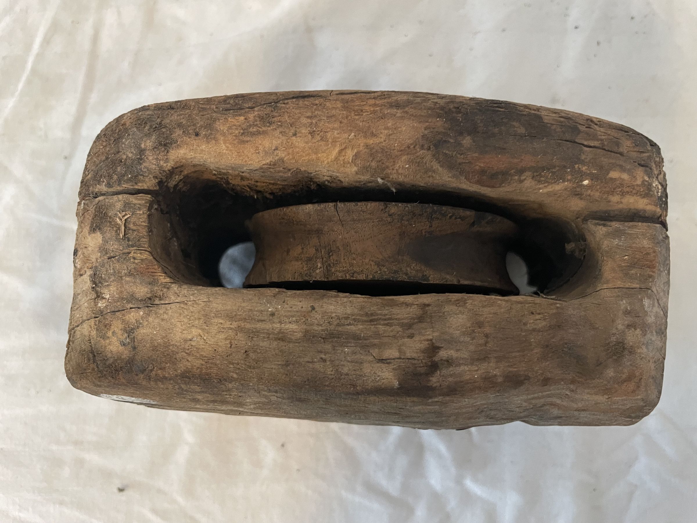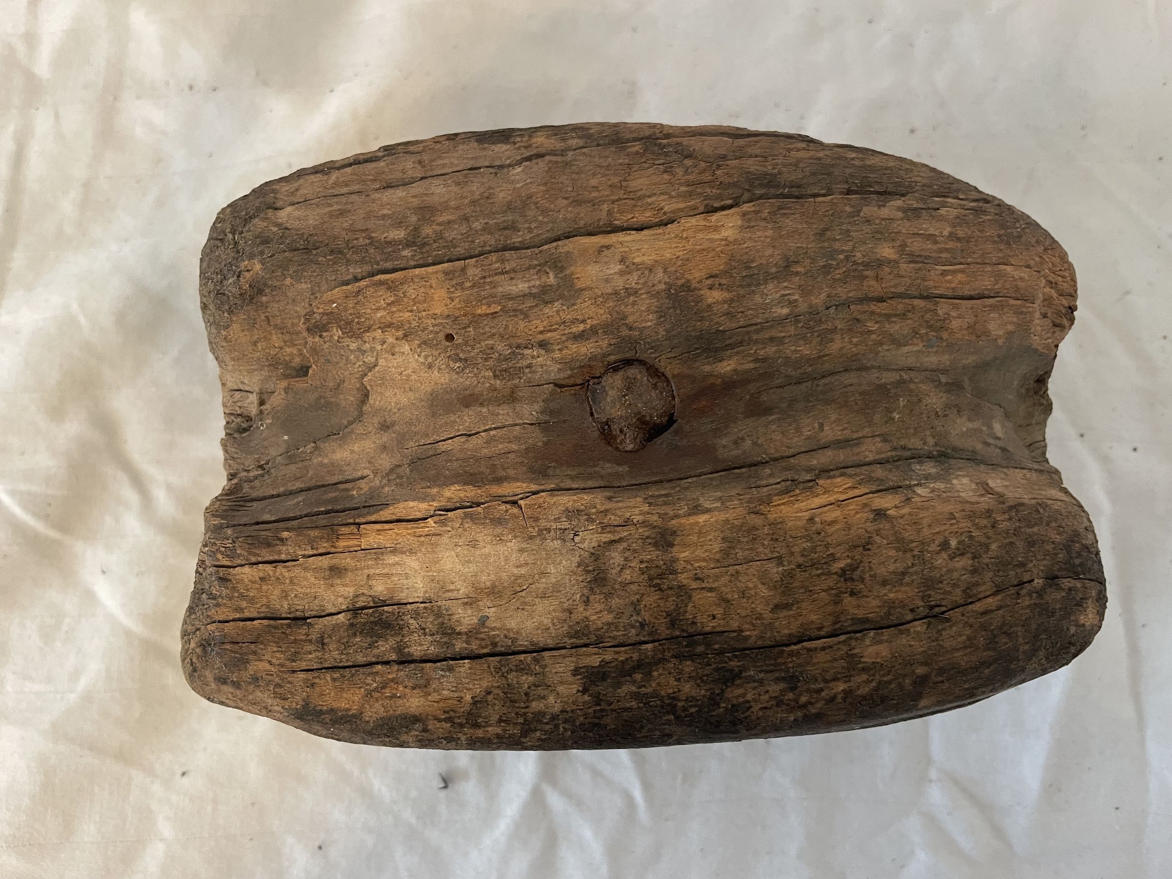 a small wooden block with a metal wheel in the center. The wood is in poor condition, but the center pulley wheel is in good shape. This is most likely from a small to mid sized sailing vessel.