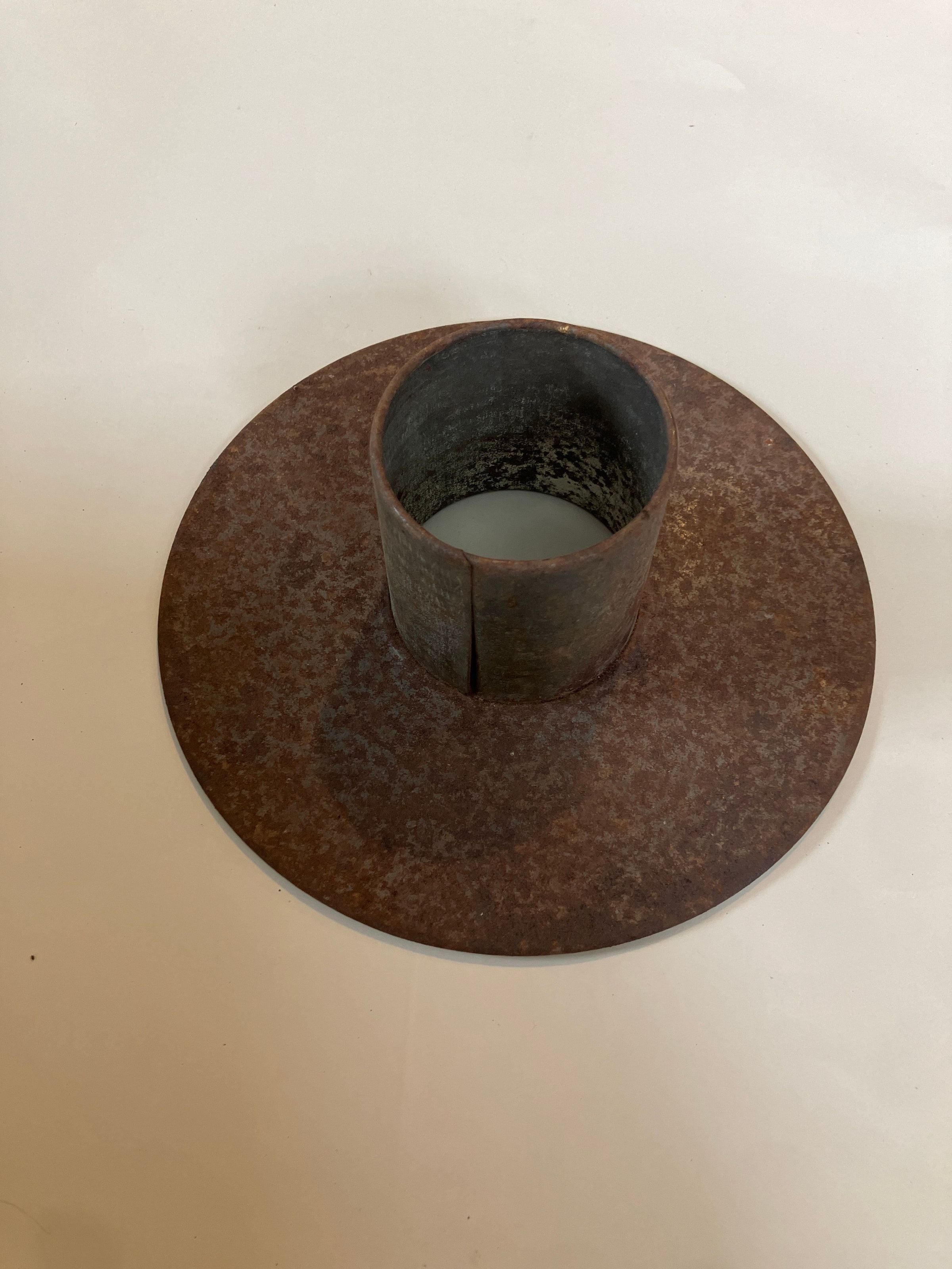 Flat metal bottom 8 7/8 inches in diameter with 4 inch hole in the center. Tube 3 inches high and 4 inches in diameter connected to the bottom and open on both ends.