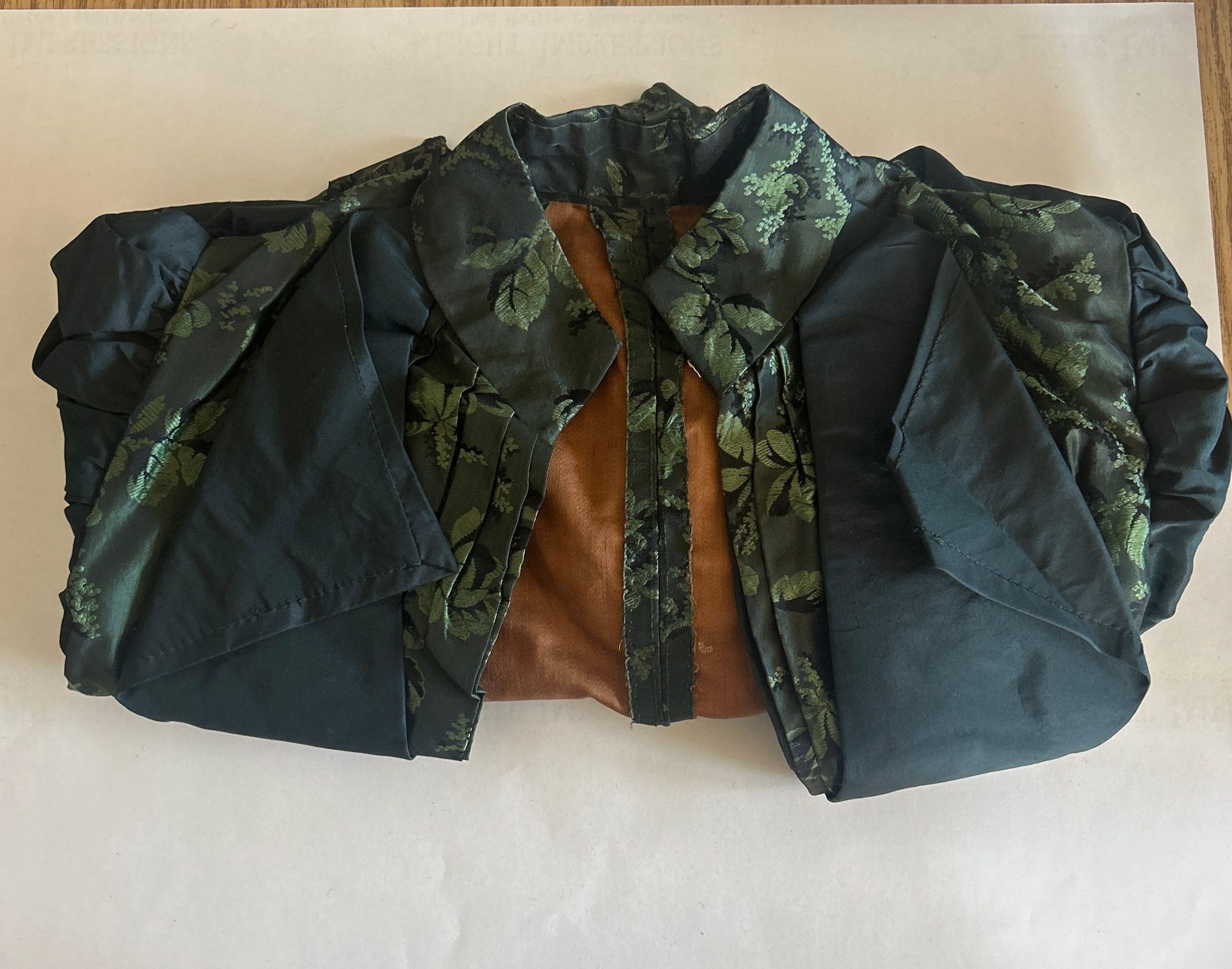 Silk bodice, approximately 19 inches long in front and back and approximately 15 inches on the sides and approximately 34 inches wide at the bust. Sleeves are approximately 22 inches long and contain puffs at the shoulders and extend approximately 11 inches down the arm. (These sleeves are frequently referred to as "leg o' mutton" sleeves.) The bodice has a high neck with wide lapels approximately 6 1/2 inches tapering to 1/2 inch down the front. The lapels and puffs in the sleeves are black, matching the skirt (1992.023.001). The rest of the bodice is in green and black patterned material also matching the skirt (1992.023.001). Hooks and eyes and buttons secure the front opening of the bodice.