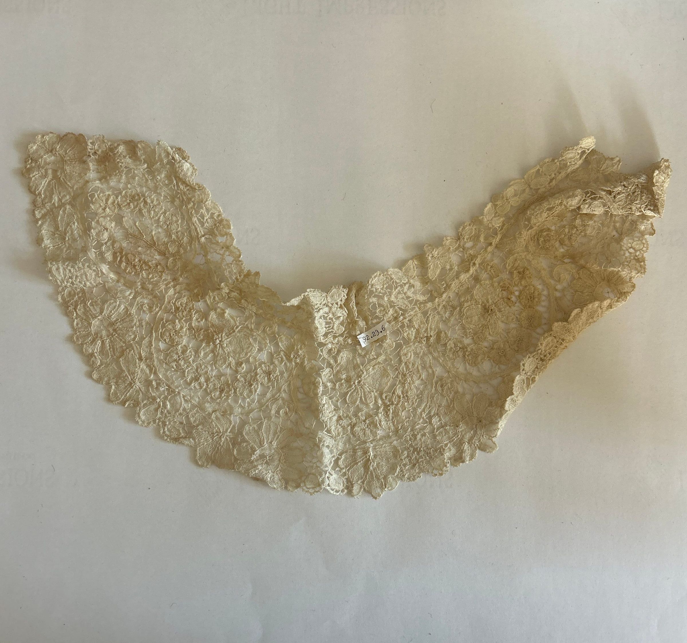 Cream colored lace collar 14 inches long at the neck and 24 1/4 inches at the bottom and 5 1/4 inches wide. Lace consists of many flower blossoms of varying sizes with connecting bands and stitches, probably tatted.