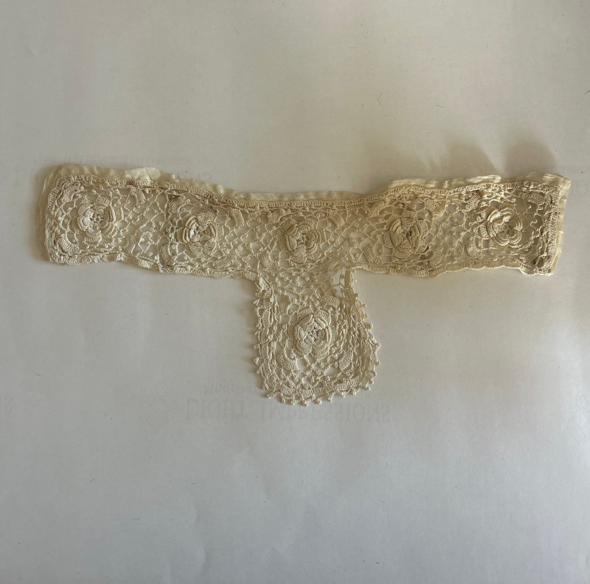 Cream colored collar, 12 inches wide, with a center section that extends below the collar edge 2 3/4 inches with a width of 2 3/4 inches. The collar is crocheted and the main motif is a series of 6 rosettes, 5 evenly spaced across the length of the collar and 1 in the "hanging" section.